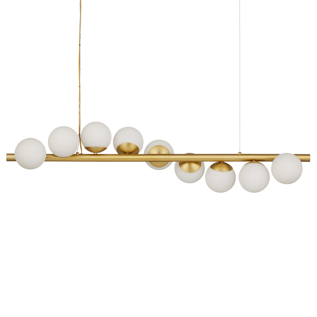 A playful arrangement of globes that meander around a central bar as beautifully as a string of pearls, the Currey & Co Barcarolle Linear Chandelier has tremendous personality. The plated metal in a brushed brass finish is a warm element of this design, while the white globes that softly glow are pale contrasts. The feeling of movement that this fixture creates will make it a conversation starter in any space.