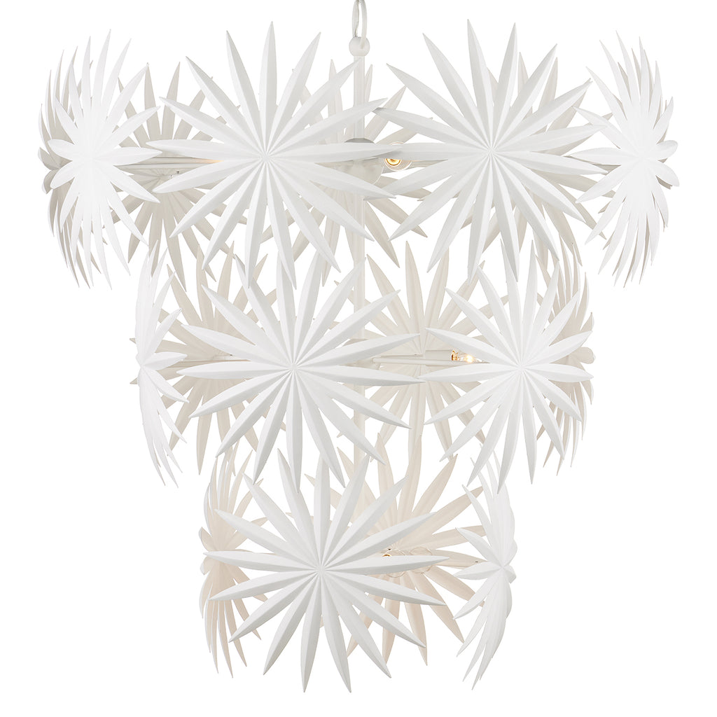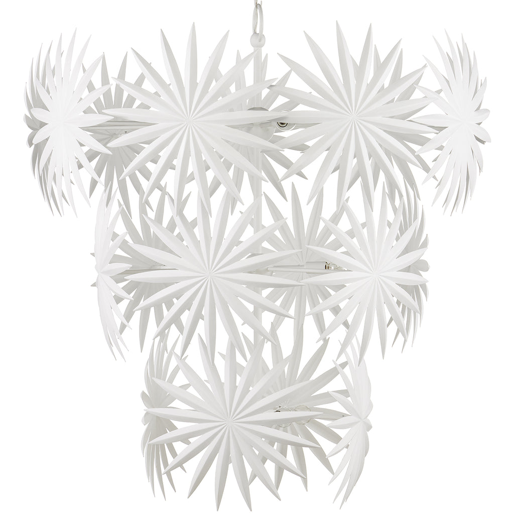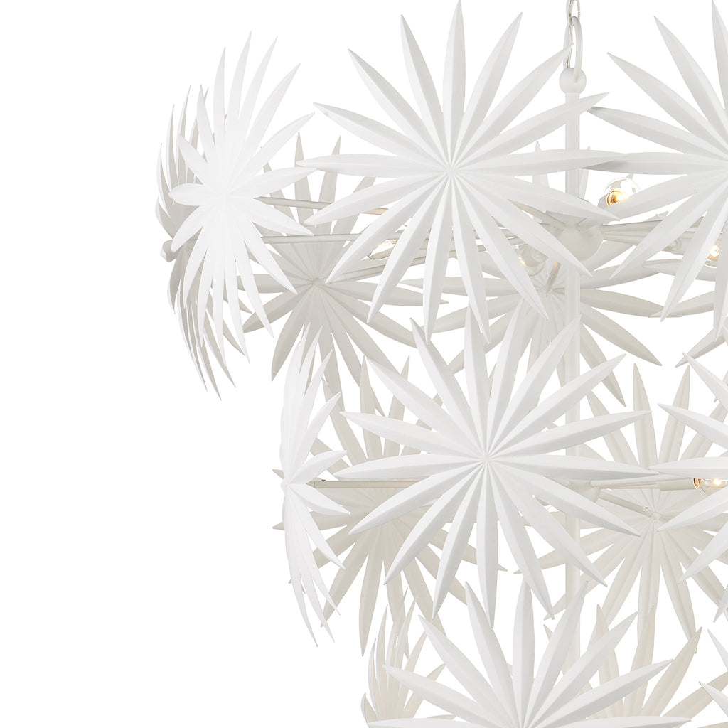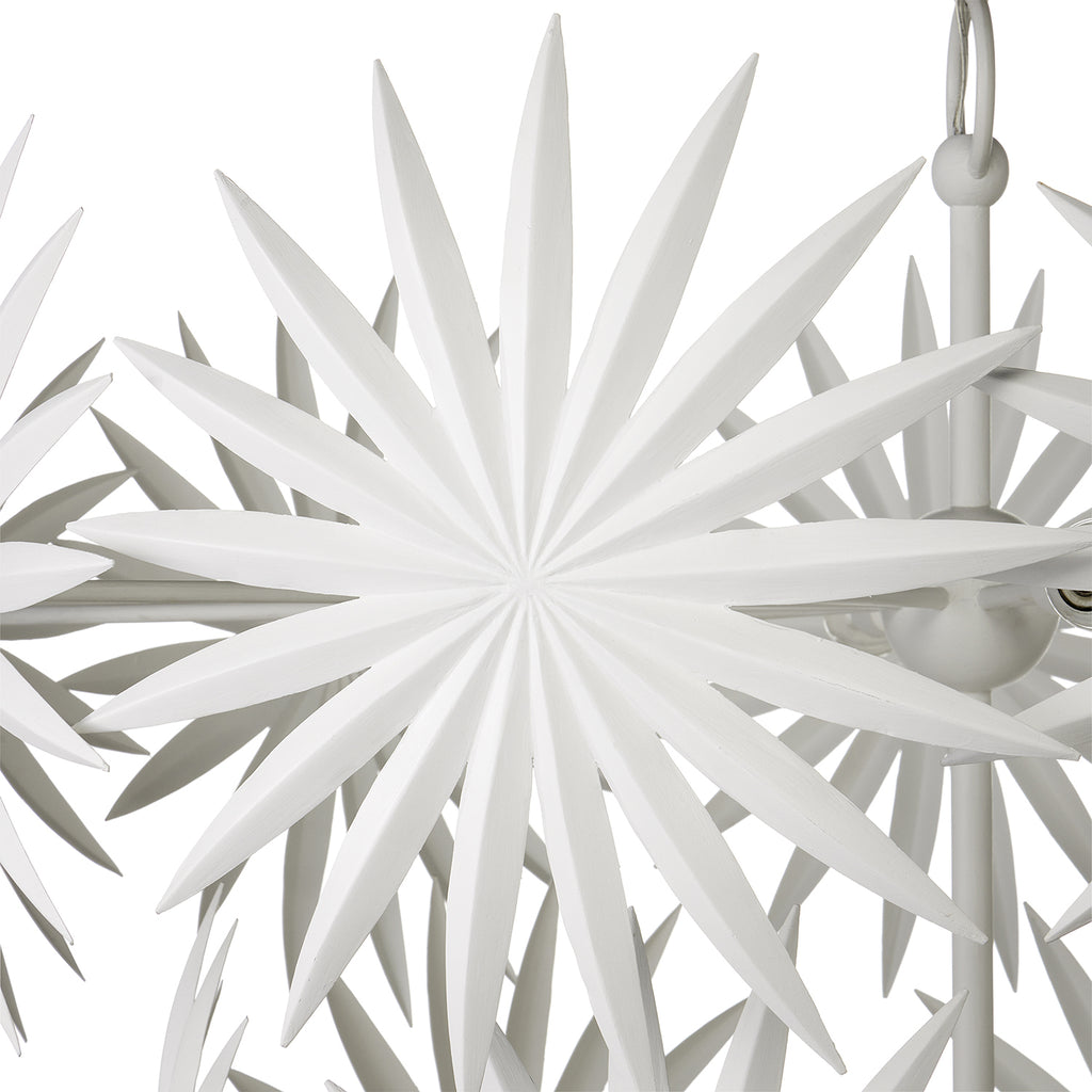 The Bismarkia Large White Chandelier was inspired by the noble Bismarkia palm, whose fronds are remarkably large. Marjorie Skouras, who designed the chandelier, has stayed true to her love of nature for this creation. Her passion for the Yucatan, the surroundings in which she lives and through which she translates the flora and fauna into dynamic products in her studio, shines in this steel fixture covered in a crisp gesso white and white finishes. The spiky ornamentations that splay around the 13 lights bring immediate texture to a space.