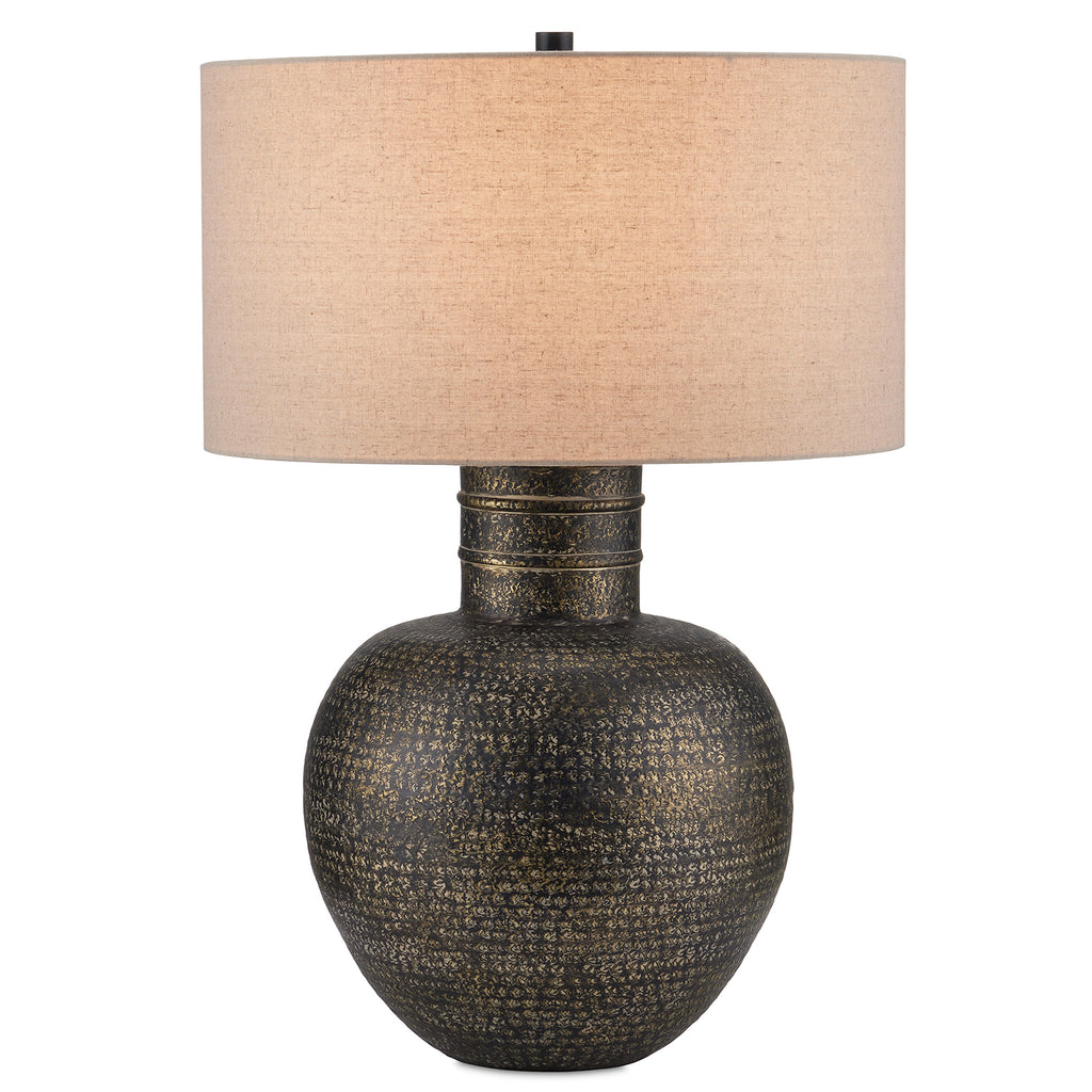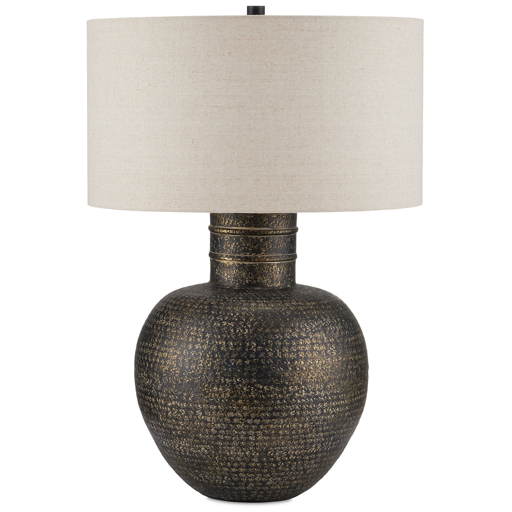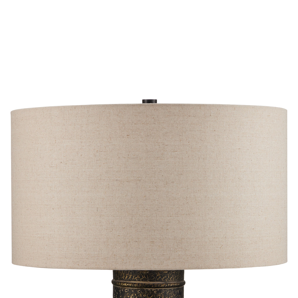 When rustic patina is desired, the Currey & Co Braille Table Lamp will deliver! Made of aluminum, the vase-shaped body has drifts of light and dark tones from the hand-applied antique brass finish that gathers in crevices and is wiped away from the hammered dimples that run along its surface. The raised rings on the neck of the lamp are a refined detail on the body that rises to meet the natural linen shade.