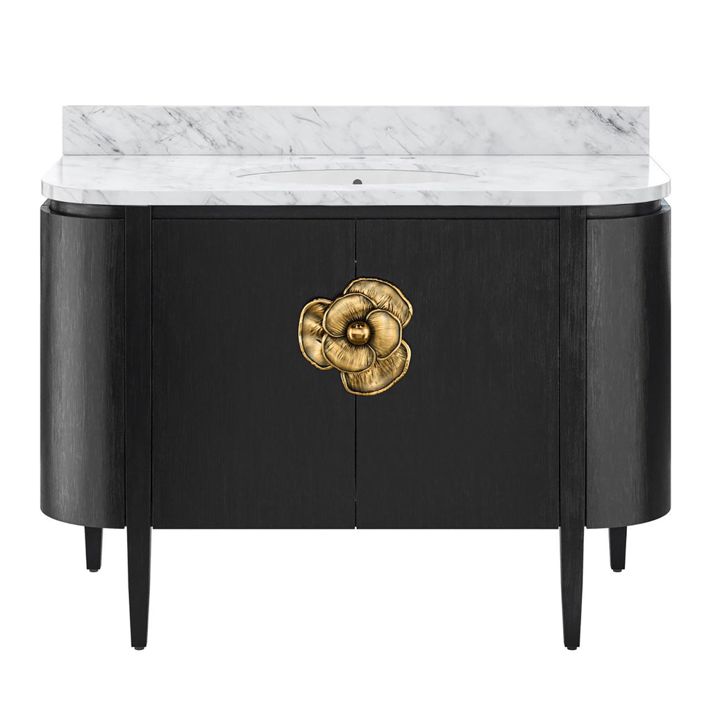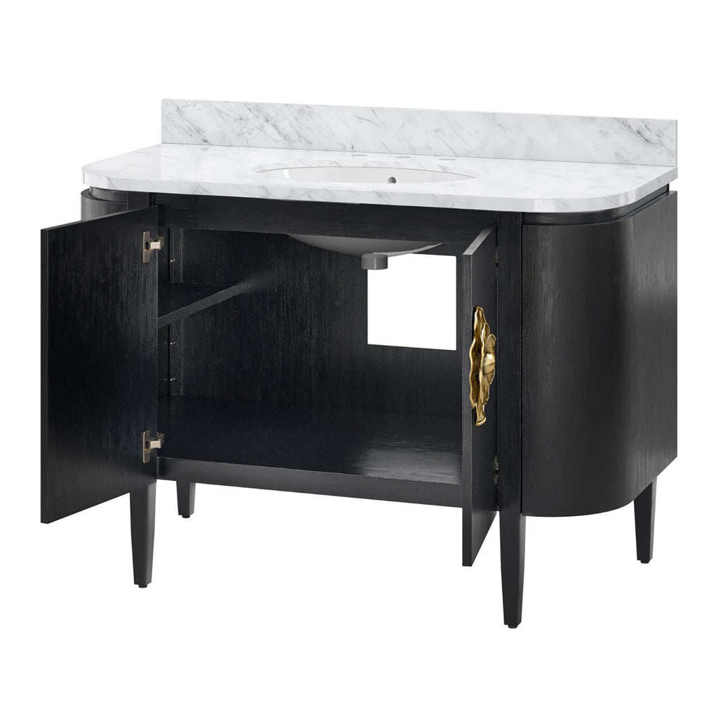 The Currey & Co Briallen 48" Black Vanity with Undermount Sink brings an elegant and sophisticated vibe to a designer bathroom or powder room. This new freestanding vanity, inspired by our longtime best-selling cabinet, is made of white oak solids and veneers, with a white Carrara marble top and backsplash, and our signature cast brass door pull. The pre-installed oval porcelain sink is by TOTO.