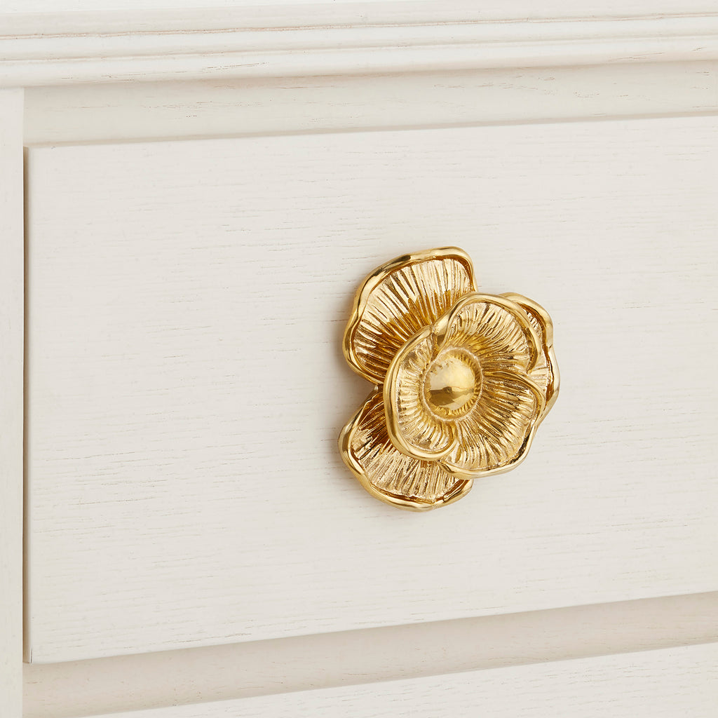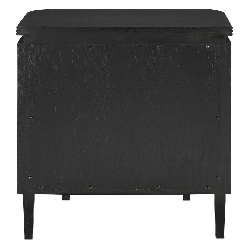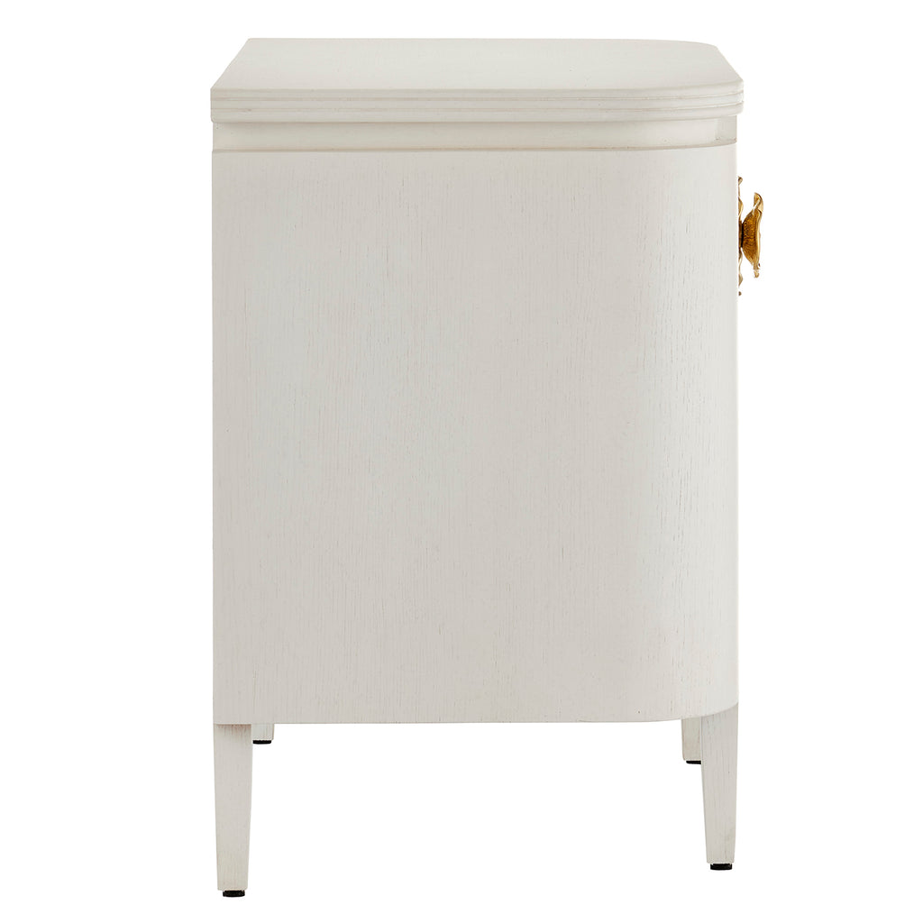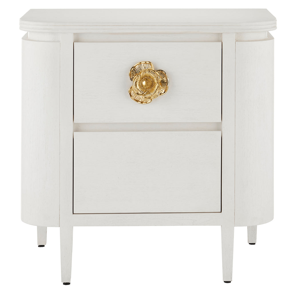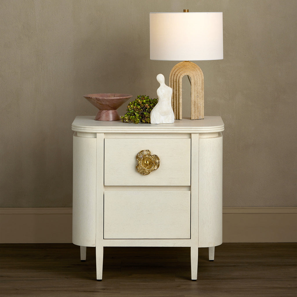 Stunning in its simplicity of lines and its artful hardware, the Briallen Nightstand has an elegant Caviar black or Winter Gray stained wood and an impressively sized flower pull that steals the show. The stylized floral accent that serves as the pull makes this cabinet a bit of haute couture for a space. Place it in a beautifully designed boudoir for its form and function.