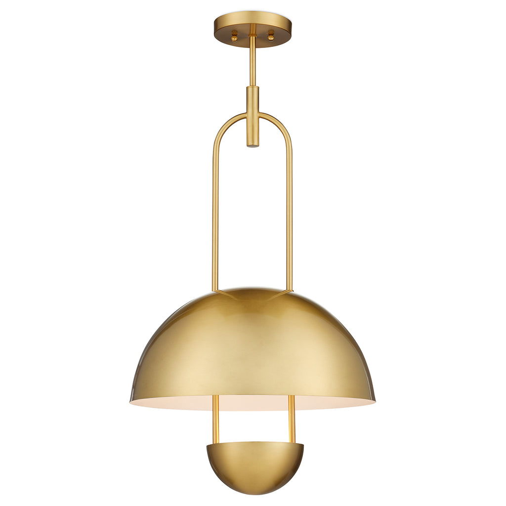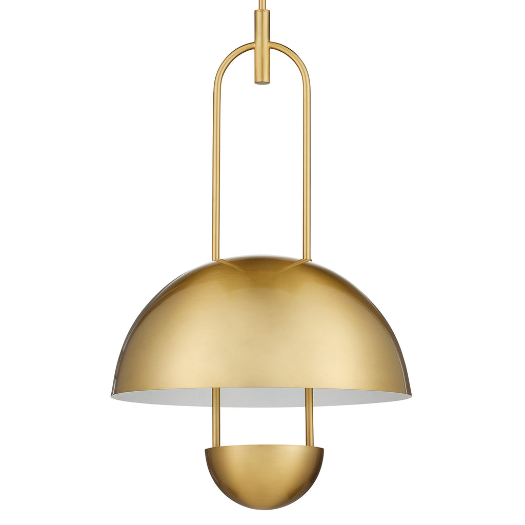 The marvelously modern Currey & Co Creighton Semi-Flush Mount was designed by Clarence Mallari. The larger and smaller dome shapes are made of spun metal with a brass finish on the exteriors and a white finish on the interiors to enhance the brightness of the light. The bottom cup is fitted with integrated LED technology. "A design detail that I like very much is the accent where the loop of the fixture connects to the rod," Mallari notes.