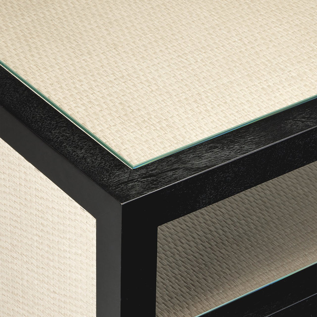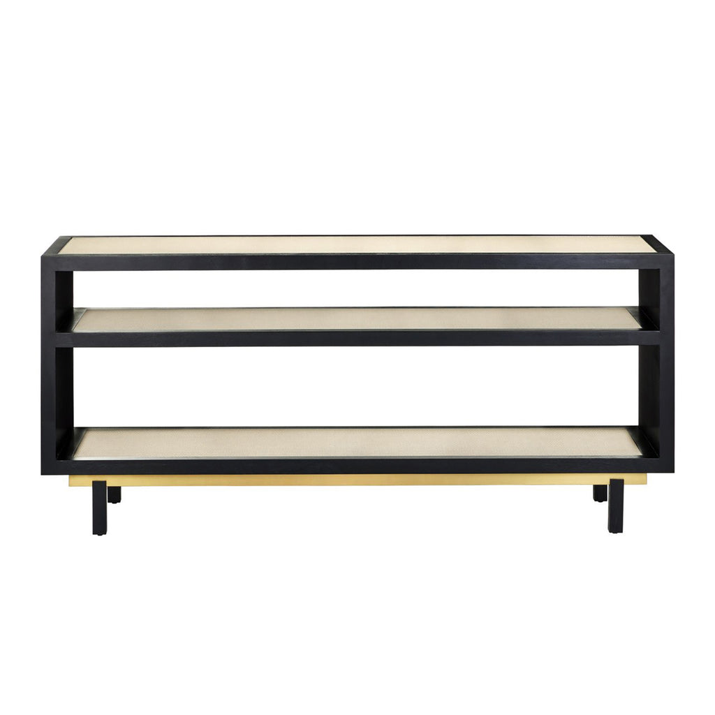The Currey & Co Deanna Console Table has panels of woven raffia on its top, sides and shelves that are surrounded by black strips of Okoume wood to coordinate with the table’s legs. The combination of black and ivory brings this piece a tailored feel that fits within a wide spectrum of design styles, especially a room that exudes Hollywood glamour. The subtle texture of the raffia is a special aspect of this design, as is the fact the table and shelves are fitted with inset glass to protect the natural fibers. A plinth base is made of metal in a brushed brass finish, the clean lines bringing added sophistication to the piece.
