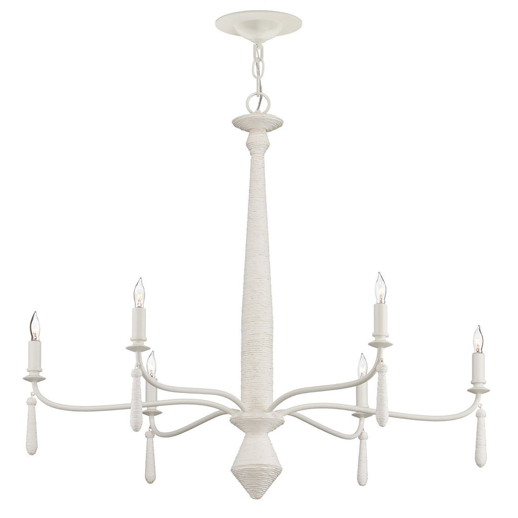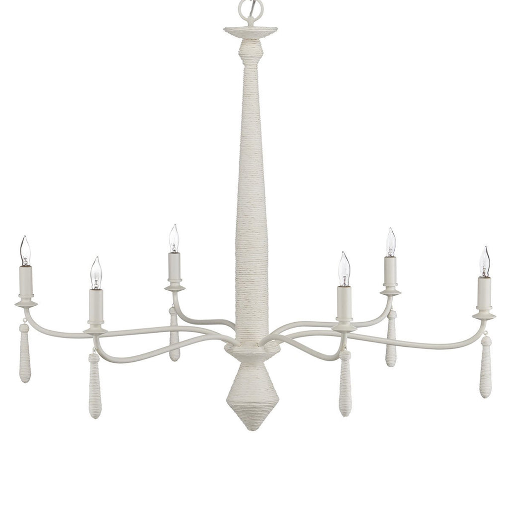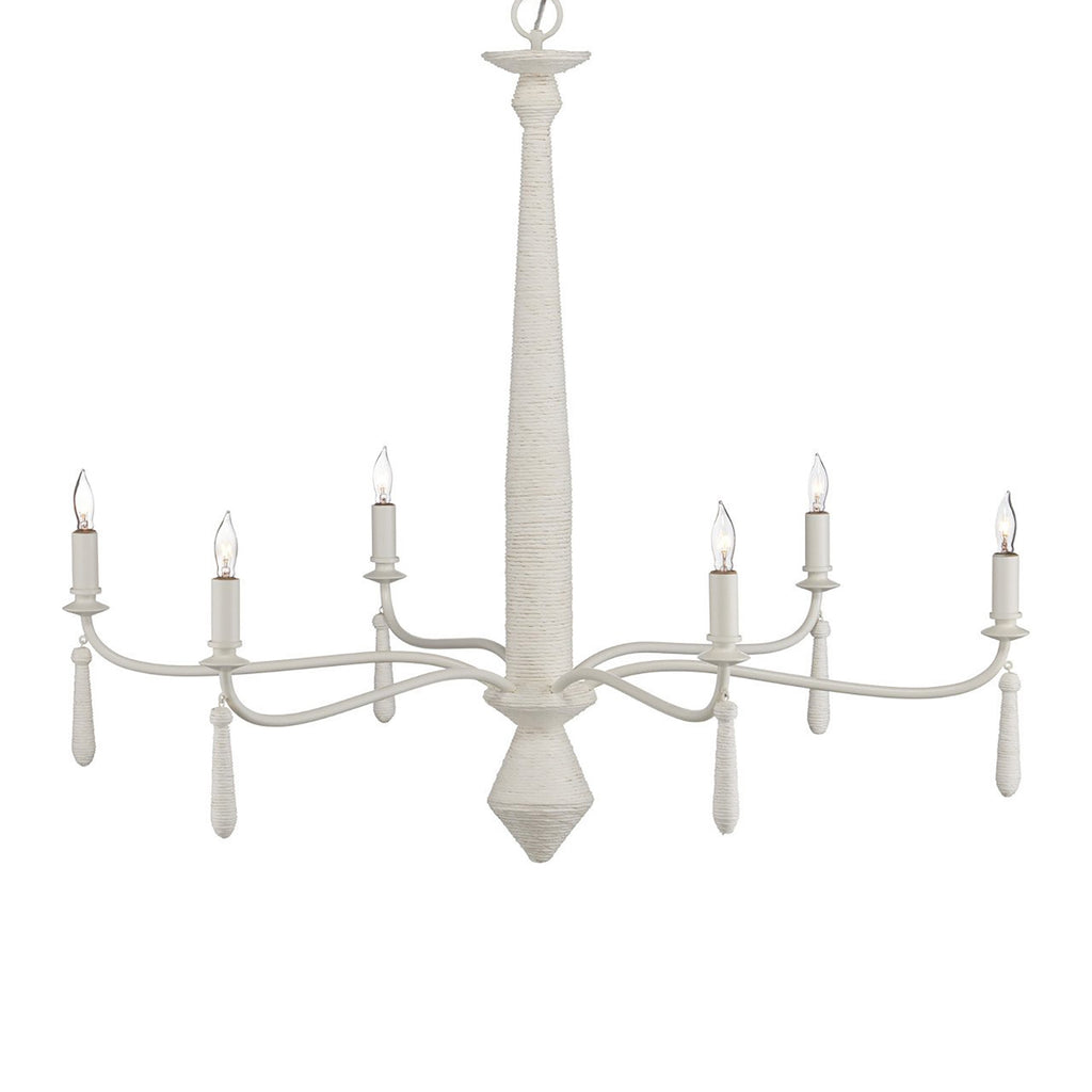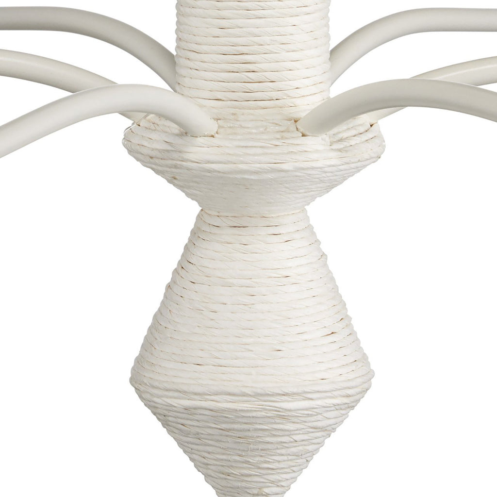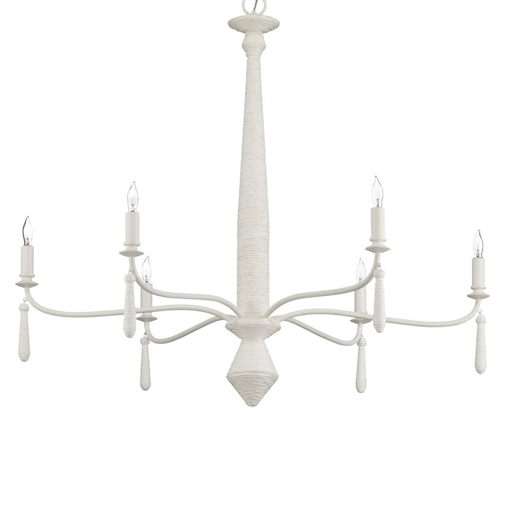 The Currey & Co Donnybrook Chandelier is a textural work of art that combines a contemporized traditional shape and pendants wrapped in Kraft paper twine. The pale material, the wrought iron forming the undulant arms, and the hardware are made seamless when a snow white finish is applied.