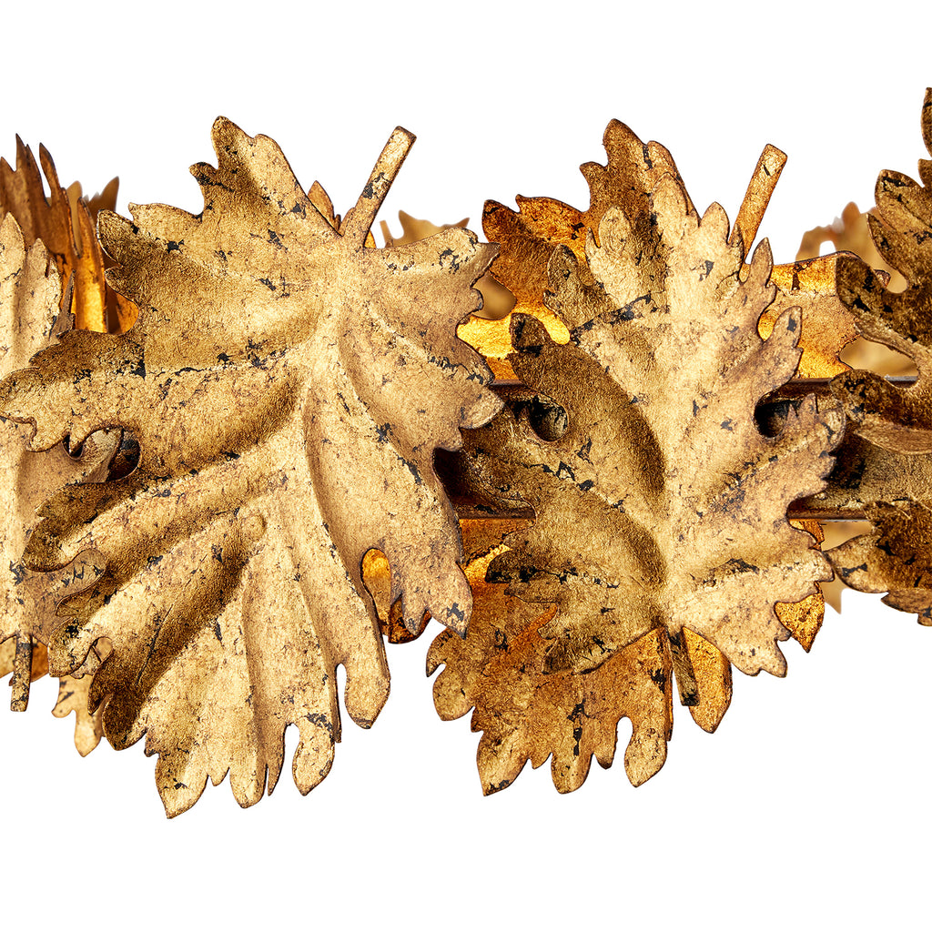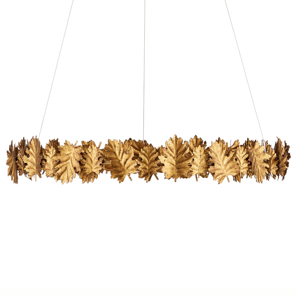 The Currey & Co English Oak Chandelier, designed by Clarence Mallari, is a nature-inspired design with a whimsical profile. Made of wrought iron in a gold leaf finish, the leaves are cut and pressed into life-like shapes. Mallari was inspired by the autumn leaves that fall each year from giant oak trees. The integrated LED strip that illuminates the fixture allows it to float because the aircraft cable from which it hangs powers the light source, making chains or rods unnecessary.
