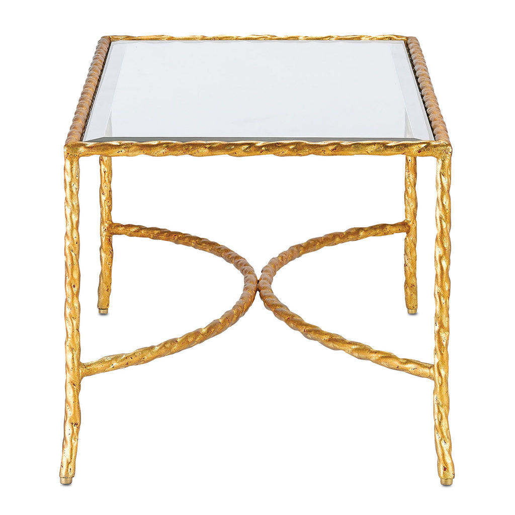 The designs of Gilbert Poillerat and Jean-Henri Jansen inspired the attributes of the Gilt Twist Rectangular Table, the classic bronze predecessors that were made for Maison Jansen in the mid-twentieth century the jumping off point for the piece. The twisting wrought iron frame that flows around the top to embrace the inset glass has been treated to a gilt bronze finish. Wrought iron was particularly associated with Poillerat, who had a decidedly art deco bent to his designs.