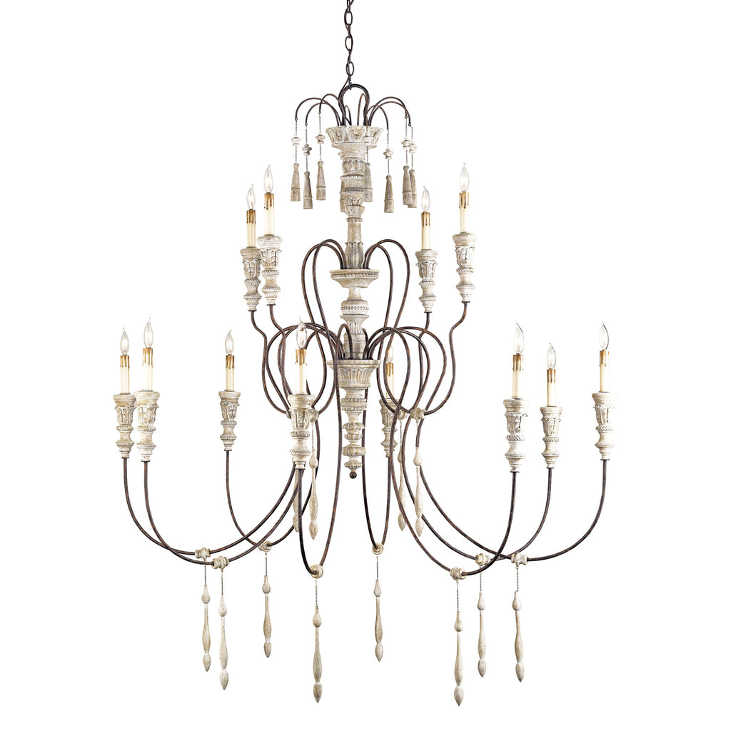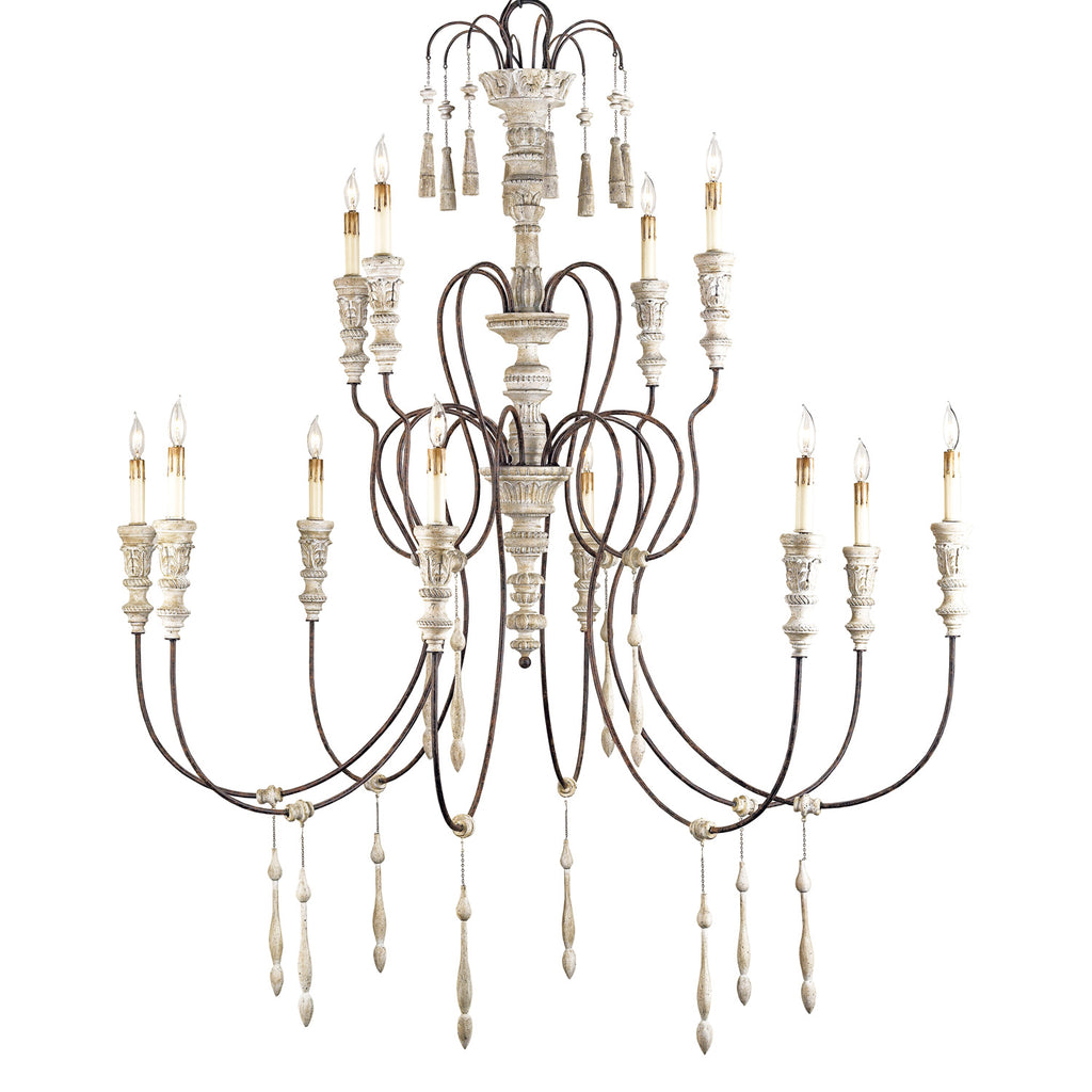 All of the exquisite details enlivening our series of Hannah Chandeliers are instilled into this large version befitting a lovely chateau in the South of France. The Hannah Chandelier provides the spaces it graces with a grand dose of charm. This exemplar of traditional European design shines brightly in large spaces. The 12-light chandelier has hand-carved accents, evocative of turned wood, that are made more graceful by our unique Stockholm white finish. The scalloped wrought-iron frame has been treated to a rust finish to bring a hint of aged beauty to this fixture.