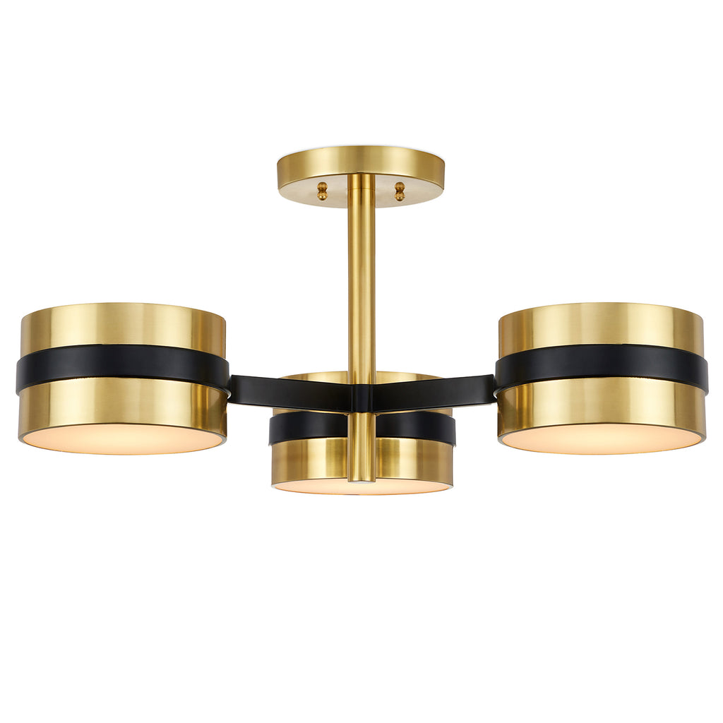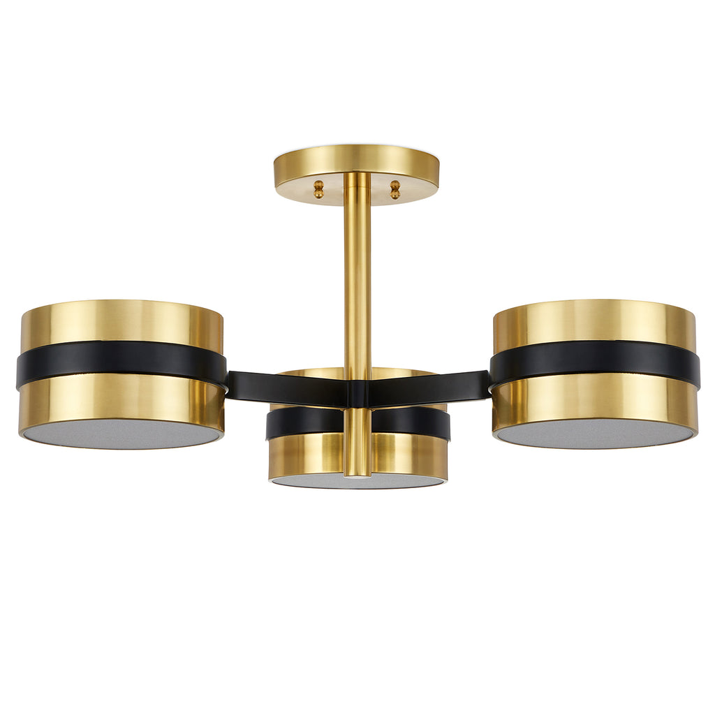 Taking his cues from mid-century modern design, Currey & Co Clarence Mallari envisioned the Heybrook Semi-Flush Mount to reflect the sensibilities of that lauded era. Made of metal in a mix of black and polished brass finishes, the gold semi-flush is fitted with integrated LED technology that is softened by white diffusers at the bottom of each of the three circlets holding the bulbs.