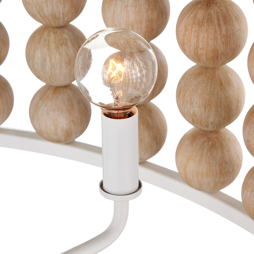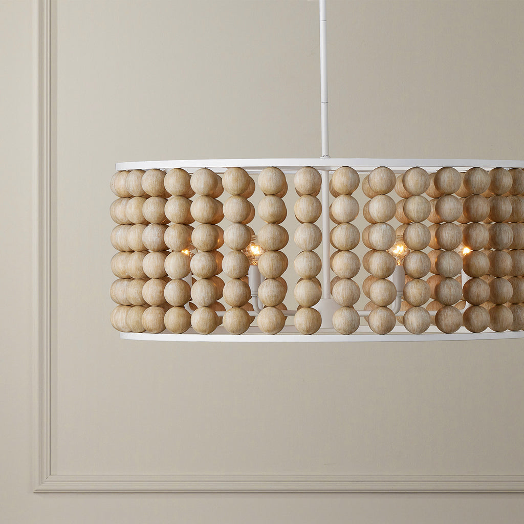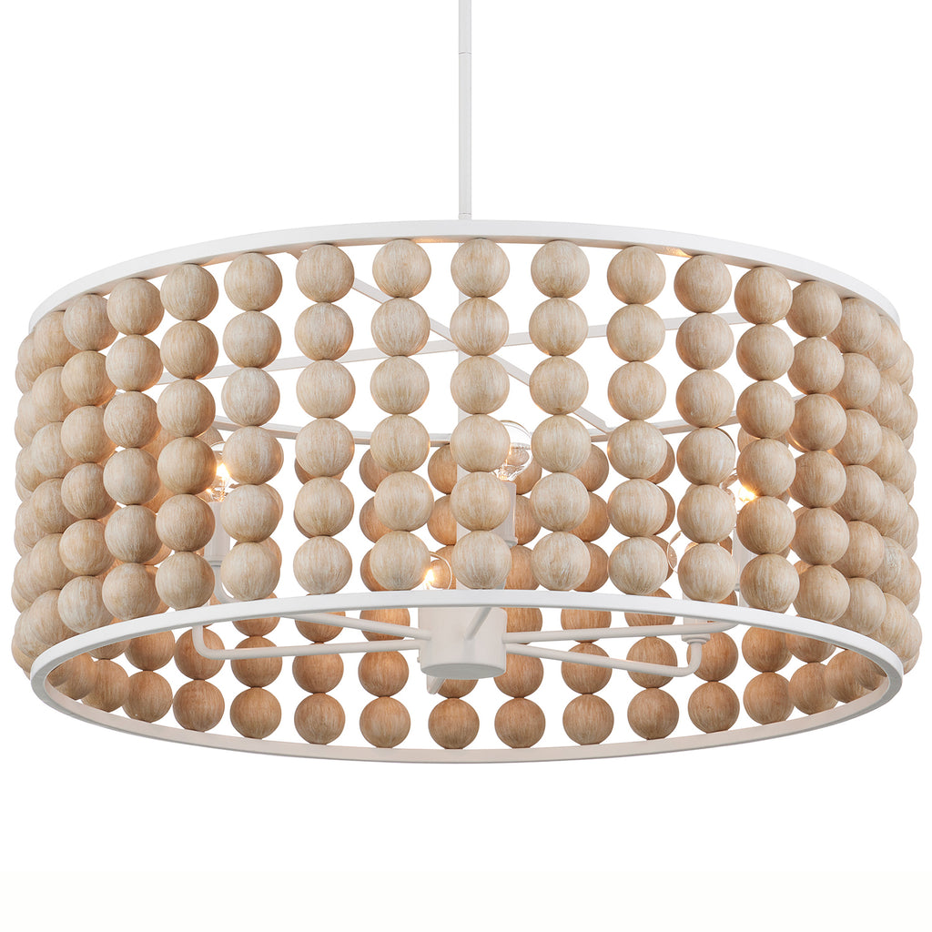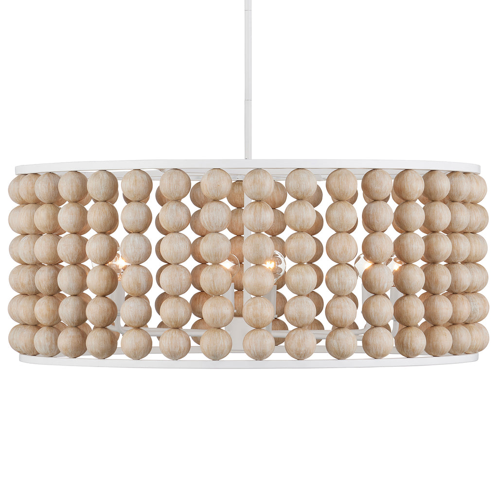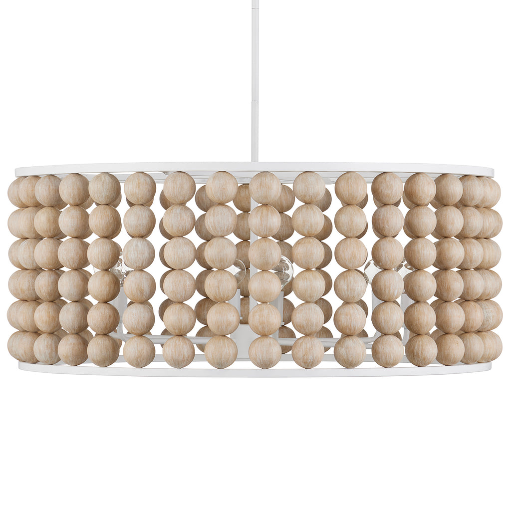 The wooden beads on this fixture were the inspiration for Ian Thornton as he designed around them to create the Currey & Co Holcroft Chandelier. The Sandstone-finished beads are fastened to a wrought iron frame dangling from a rod, both in a Sugar White finish to make this design surprisingly light. The large size of the beads is one of the surprising elements to this design that skews bohemian in style.