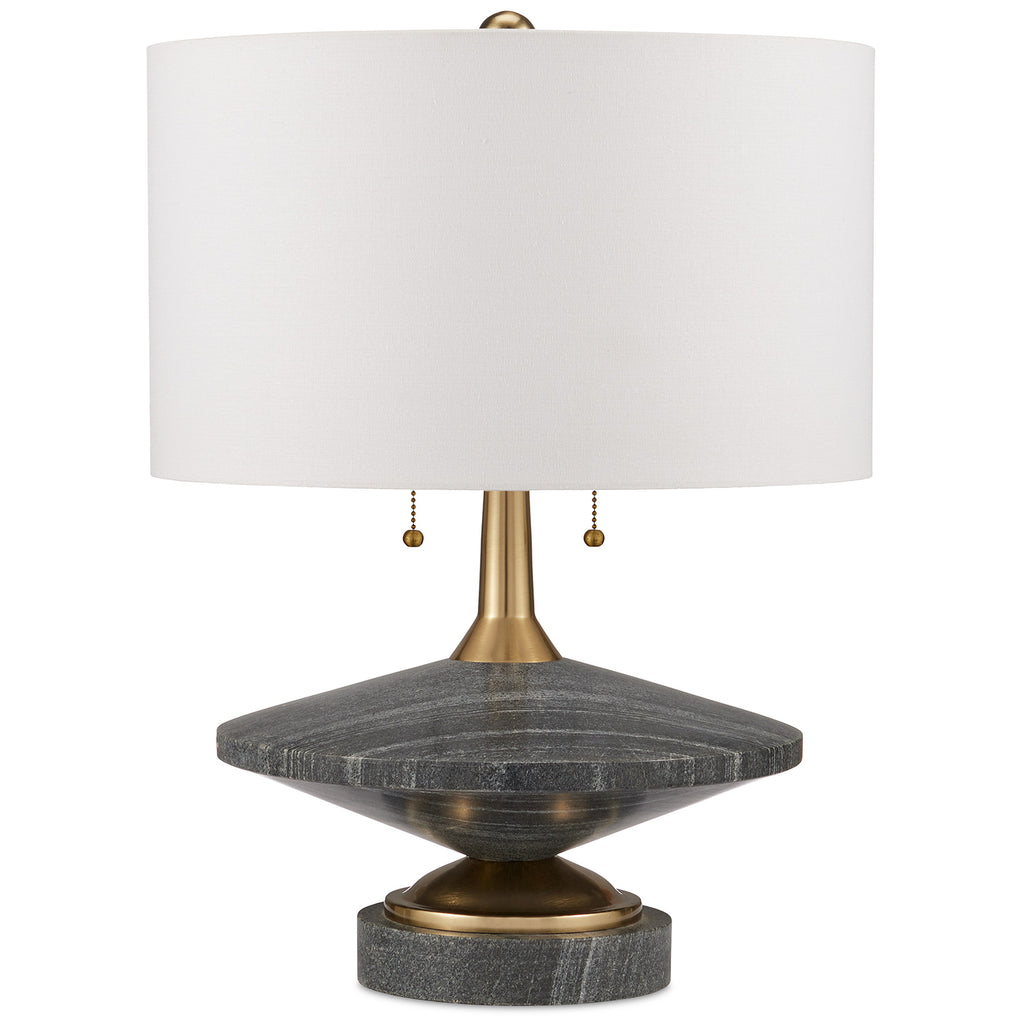 Drawing his inspiration from the mid-century modern era, Tom Caldwell designed the Jebel Table Lamp from turned stone elements with incredible personality. The aluminum details in a brushed-brass finish contribute to the warmth of this black lamp's profile, as does the beige linen shade from under which delicated pull-chains dangle.