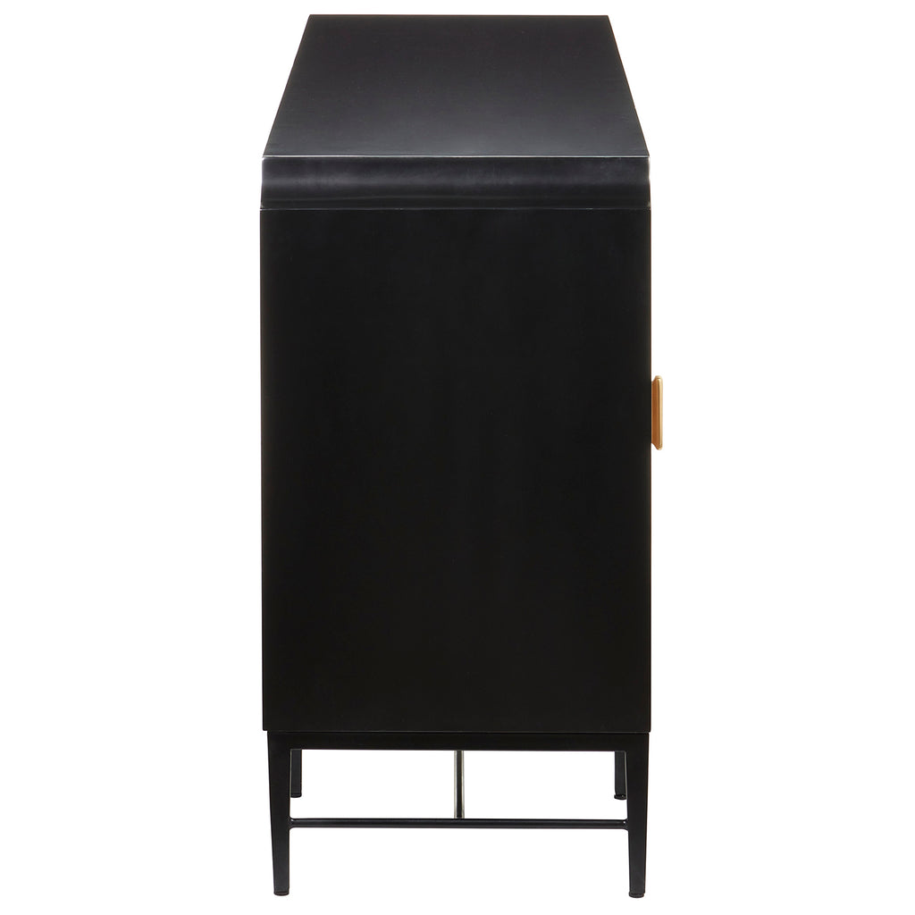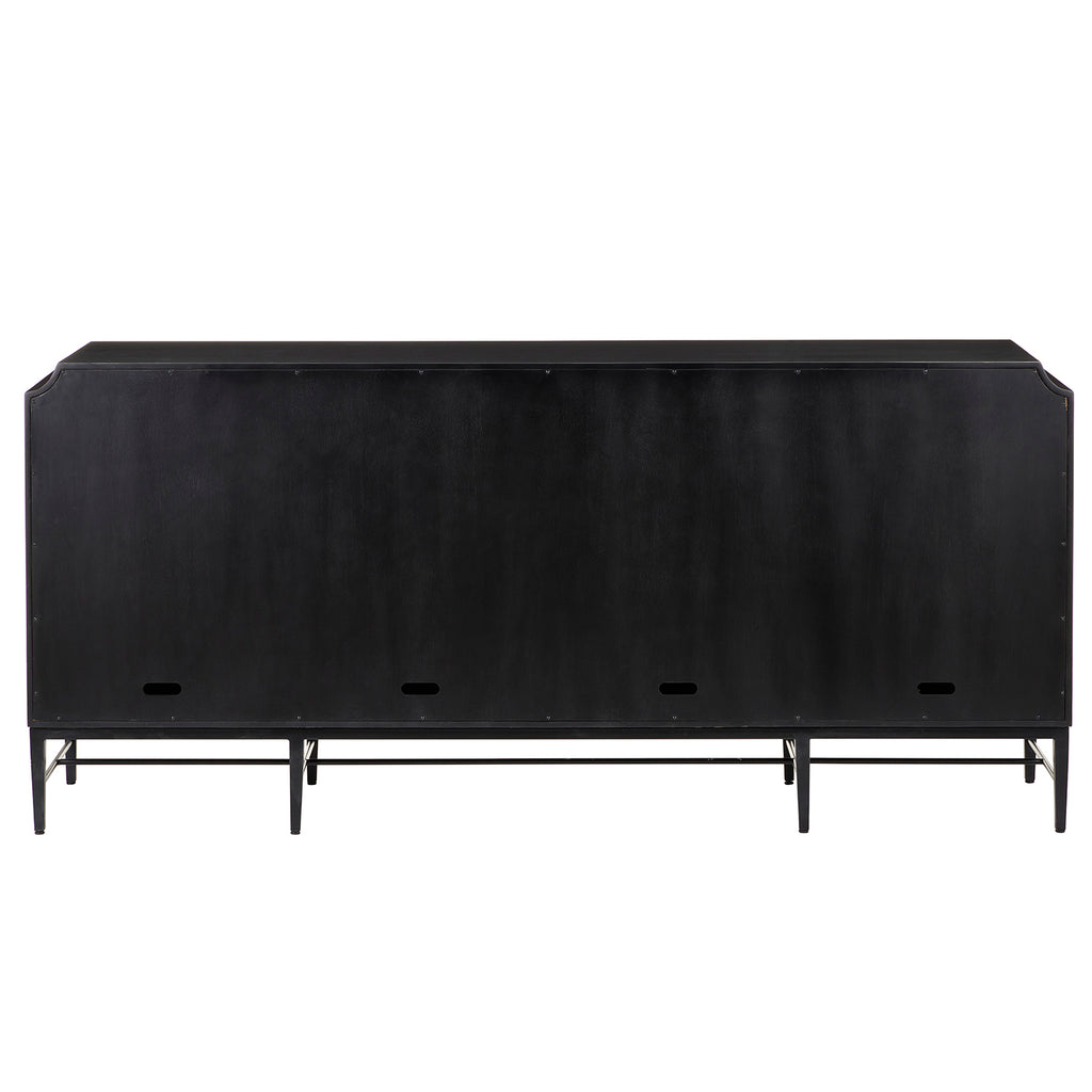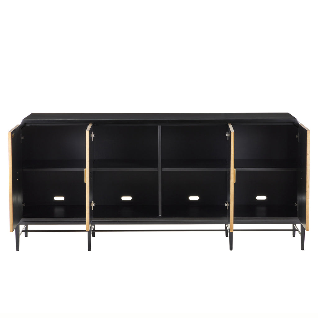 The Currey & Co Kallista Credenza has a taupe finish that enlivens the figured sycamore veneers on its door fronts. The wood grains bring the credenza a hint of distressing that contrasts the rich black of the cabinet's exterior. The door pulls are in a polished brass finish. Specialty treatments on this artful tan chest include soft-close doors and cord management openings.