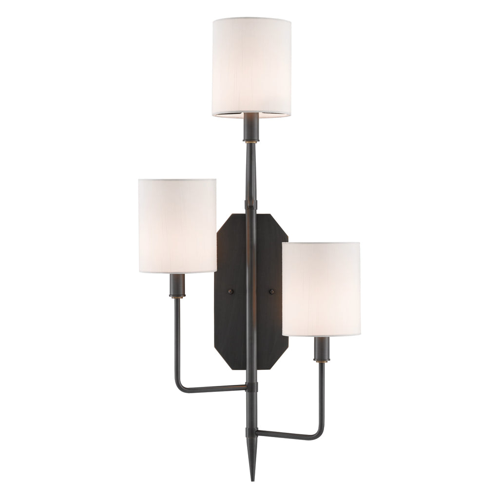 Founded during a time when chivalry was at its height, the namesake village of our Knowsley Left Wall Sconce saw its fair share of pointed incidents. The restrained design of this fixture with its straight-as-an-arrow stem and three tailored off-white shantung shades bring it a noble personality. The oil-rubbed bronze finish on the metal will make this sconce equally at home in a handsome den as it is in an elegant boudoir. For flanking headboards or fireplaces, we offer a right and a left sconce in the Knowsley.