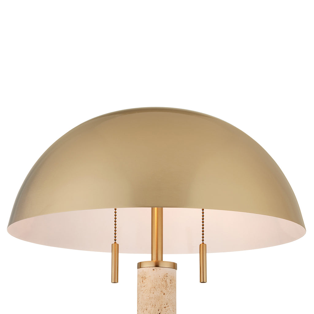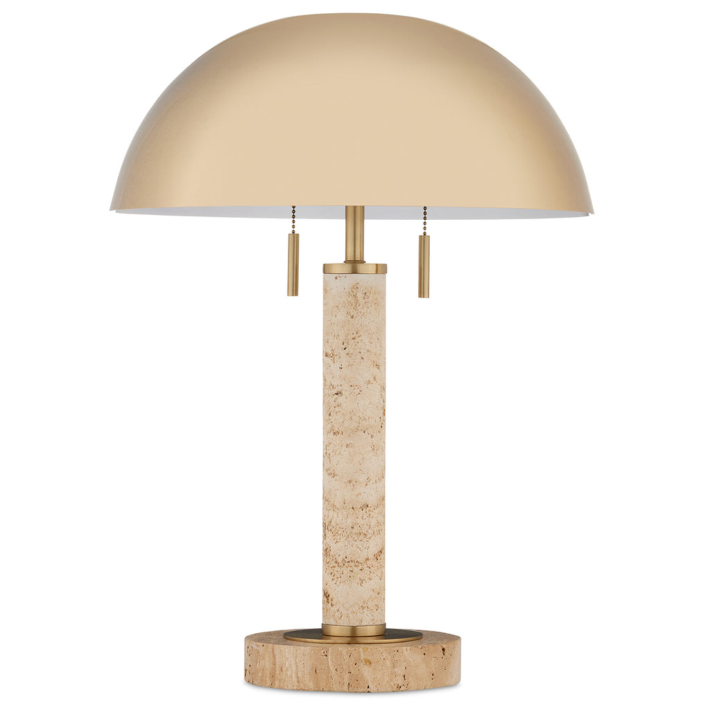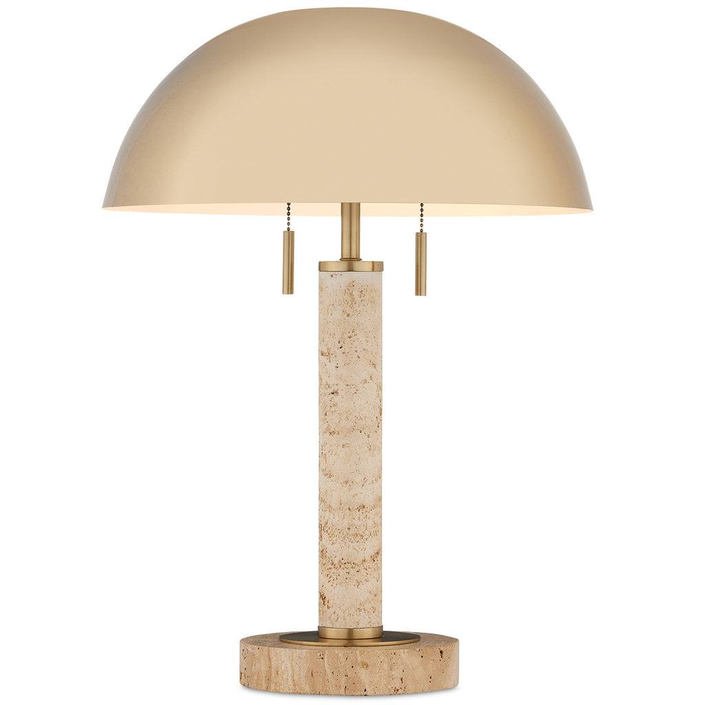 Aimee Kurzner designed the Currey & Co Miles Table Lamp; the travertine lamp inspired by other pieces with the same name. The mid-century modern vibe is enhanced by the simple shapes of the lamp's base and body, and the domed brass shade that caps it. Because this beige lamp is made of natural stone, texture and color may vary from lamp to lamp.