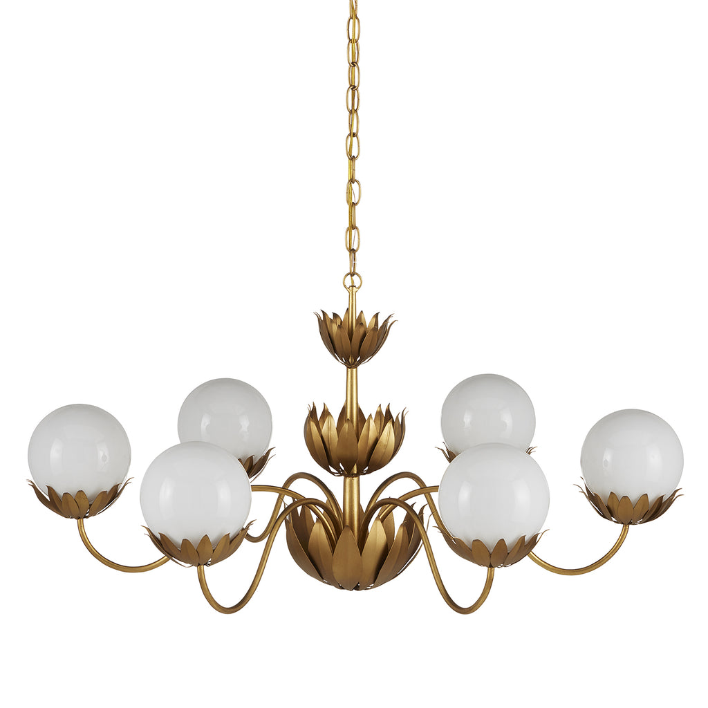 When he designed the Mirasole Gold Chandelier, Tom Caldwell was feeling nostalgic, remembering the décor of ice cream parlors that were staples at one time in America. The milky glass globes are supported on shapely stems in a contemporary gold leaf finish and ornamented with fluted leaf patterns in a darker gold finish to add interest. The globes on the fixture glow brightly when the lights are switched on; the illumination bringing the rich brass finish a high sheen.