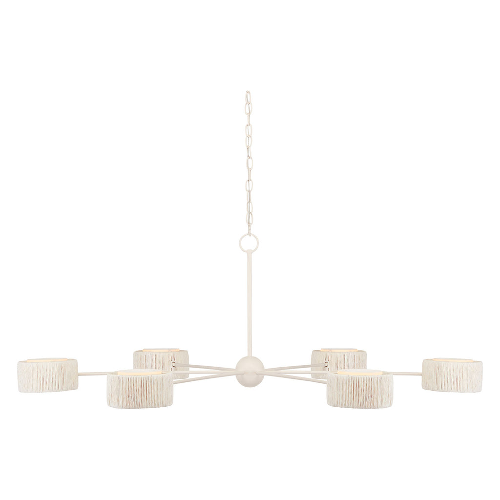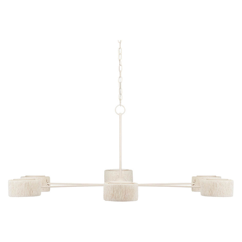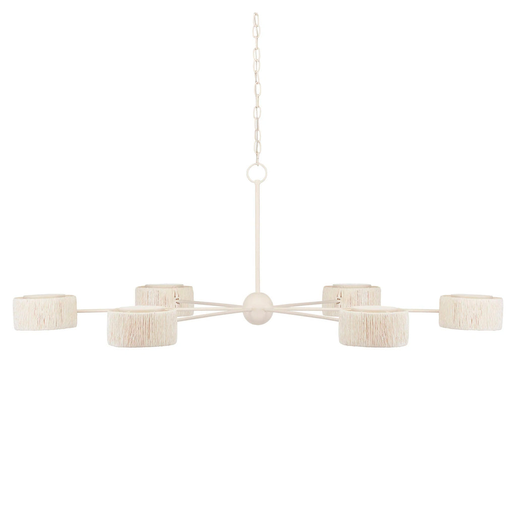 With shades made from recycled paper that has been twisted like braided hair, the Currey & Co Monreale Chandelier, designed by Clarence Mallari, has a frame made of round tubing that telescopes out from a central cog. The paper is painted white and the wrought iron frame has a vanilla finish that contributes to the lightness of this ivory chandelier. The shades are fitted with acrylic diffusers on the bottoms and there are no transformers because the fixture has an LED light engine for the latest in lighting technology.