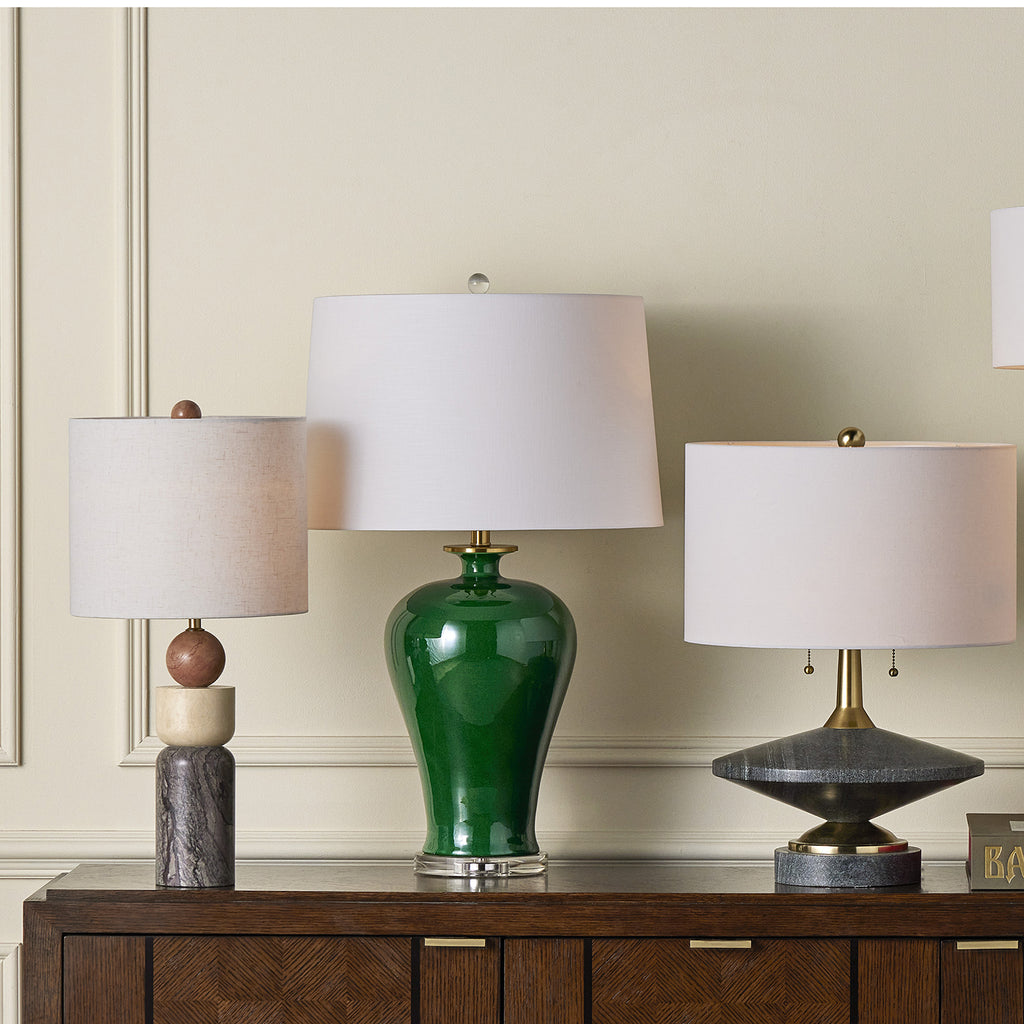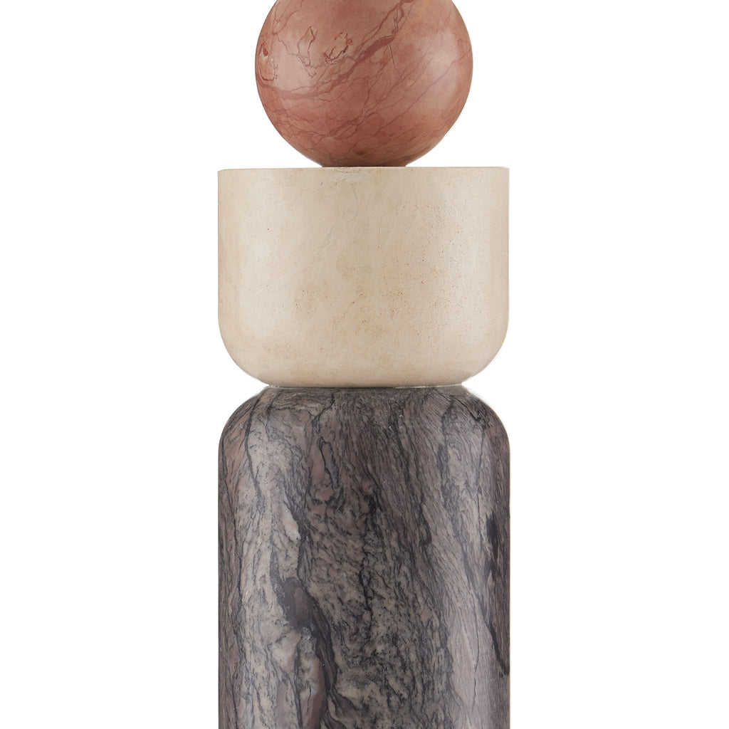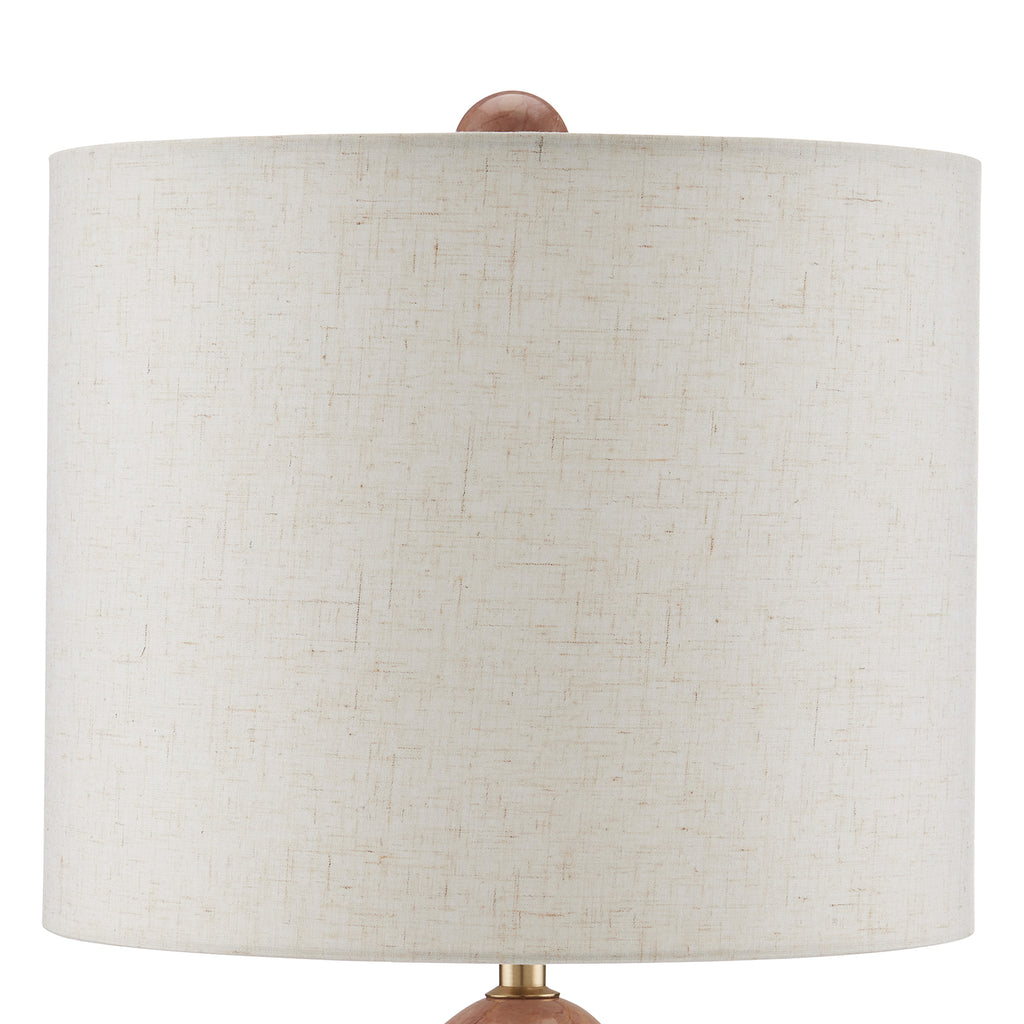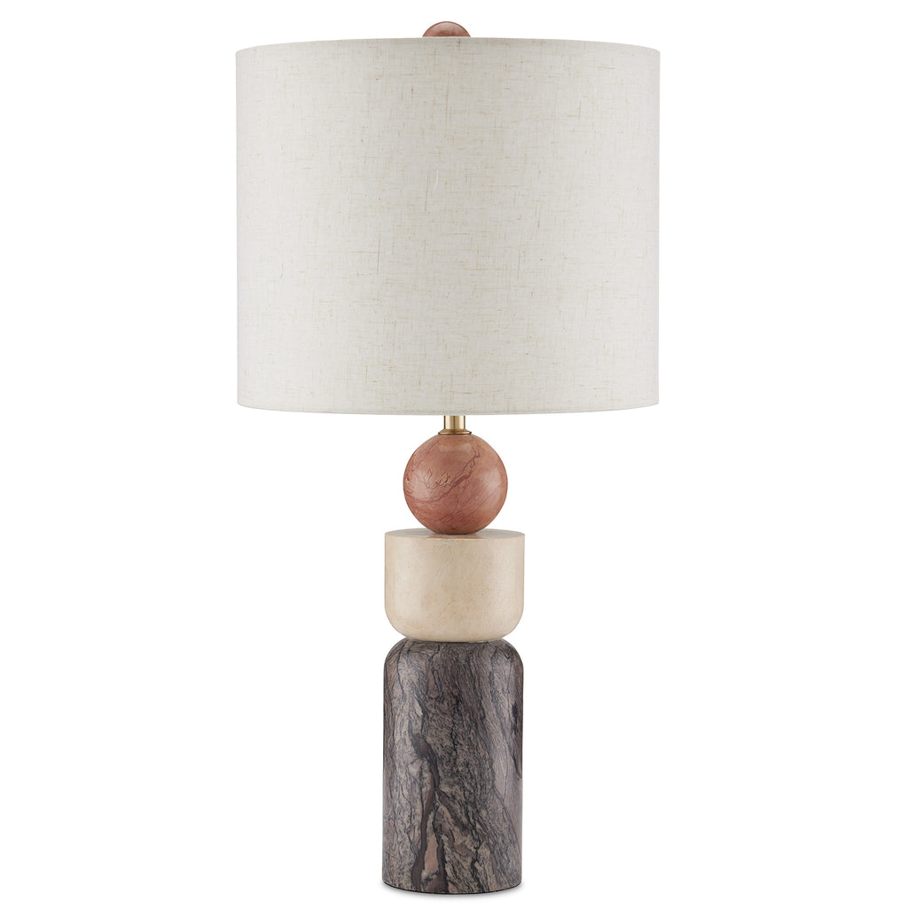 A delightfully geometric composition, the Currey & Co Morena Table Lamp is made of sections of Rosa Cappuccino Marble, Camello Neve Marble, and Breccia Marble. Designed by Aimee Kurzner, the multi-colored lamp is fitted with a beige poplin shade that is fastened with an orb finial, which matches the top Rosa Cappuccino marble ball. Because this contemporary lamp is made of natural stone, colors and patterns will vary.