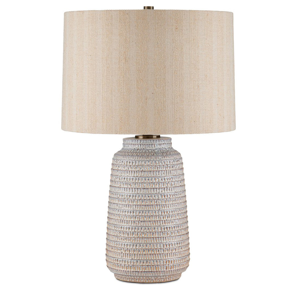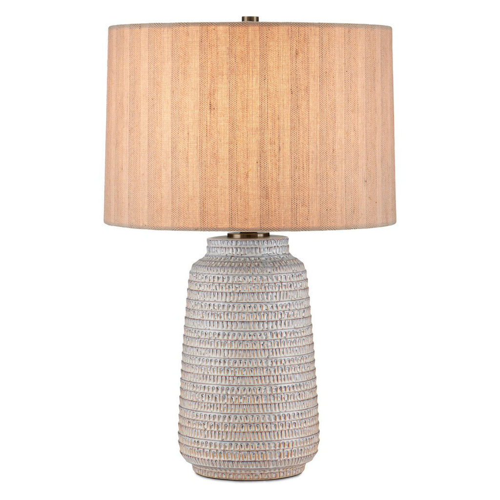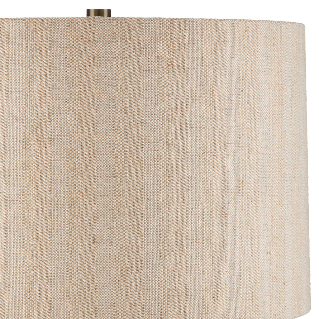 The Currey & Co Owen Table Lamp is made of ceramic with a tone-on-tone toothy pattern that is glazed in off-white and pale brown that creates a textural effect. Also contributing is the shade that has different patterns woven into it. The antique brass hardware and finial add to the warmth of this piece.