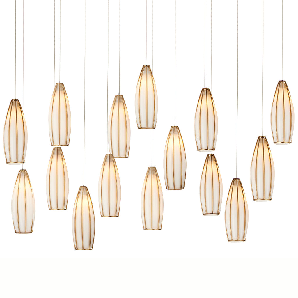 The Currey & Co Parish 15-Light Rectangular Multi-Drop Pendant has slender tear-drop-shaped shades made of white glass poured into a metal cage in an antique brass finish when it was still molten. A remarkable result of this process is that it creates tiny pinholes of light that escape through micro-bubbles that formed in the glass, making the Parish effervesce like an upside-down goblet of champagne.