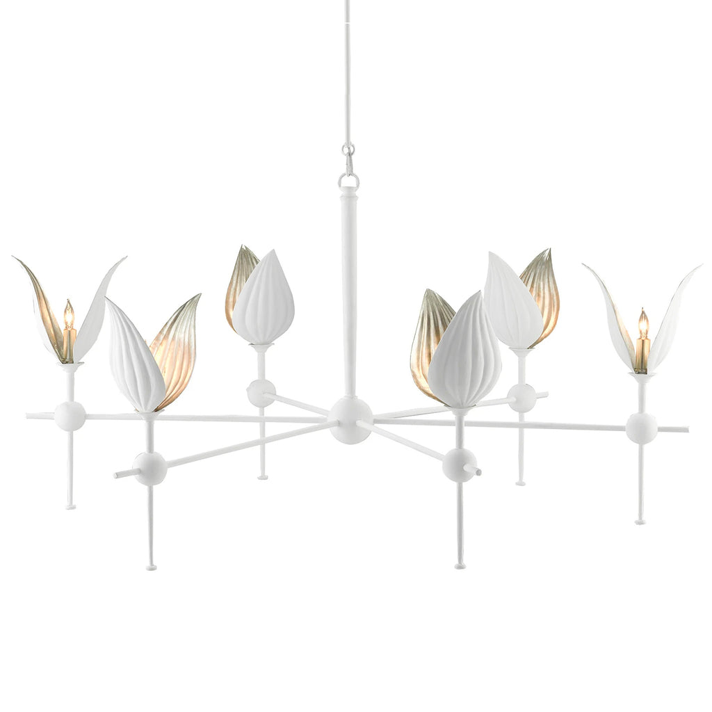 Made of wrought iron in a gesso white finish on the exterior and a silver leaf finish on the interior of its shades, the Currey & Company Peace Lily chandelier is one of the Currey & Co designs that proves how a brute material can be made to appear delicate. This white chandelier with its floral motif is a versatile design with a gesso finish and silver leaf accents to fit it into the genre of 1920s Paris styling.