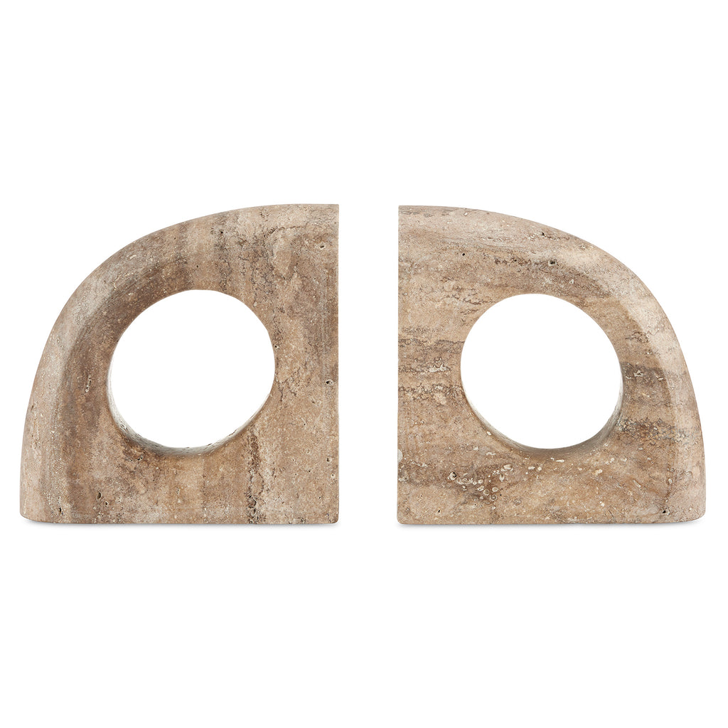 The Currey & Co Russo Travertine Object Set is made of titanium travertine; the surfaces of the sculptural pieces swirling with a more dynamic pattern than some travertine stones do. These brown sculptures were designed so they can also stand in for bookends. The pitting and veining on these objects will vary from piece to piece, given they are made of natural stone.