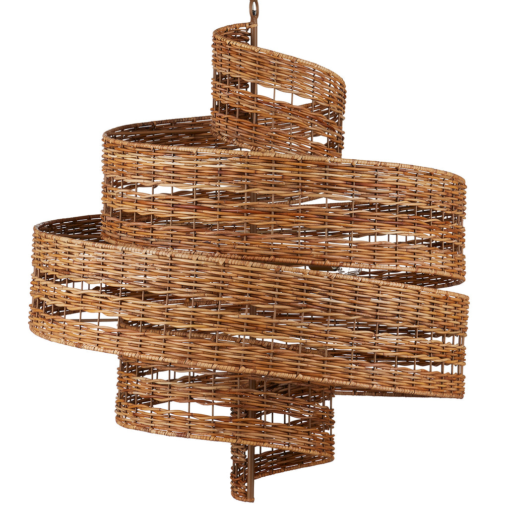 Hiroshi Koshitaka envisioned the Currey & Co Saisei Medium Chandelier as one of a number of fixtures he sees as fulfilling the concept that encompasses the acts involved in regeneration and reproduction as we restore, revive, and experience regrowth and rebirth. Rattan flows artfully around a spiral wrought iron frame in a khaki finish, which is tonally in sync with the natural color of the material. The otherworldly shape of this rattan chandelier was inspired by outer space — galaxies in the universe come to light.