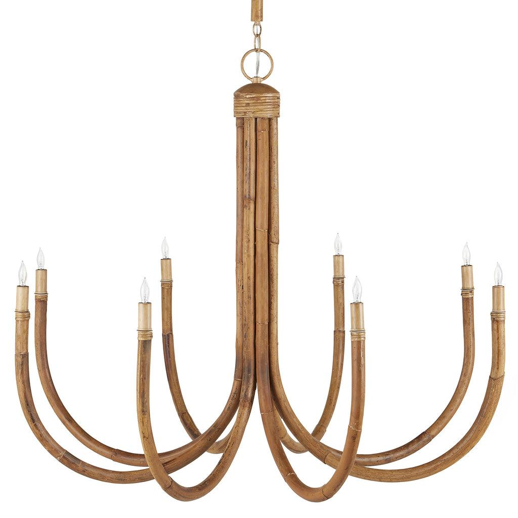 The Samsara Rattan Chandelier is an overscale fixture made from thick reeds of rattan that encase the wire running through the fixture. Bending rattan this thick takes great skill and effort. In order to keep the aesthetics of the chandelier clean, the candle sleeves and hardware are in a saddle tan finish, and the thinner reeds that wrap these in place are tonally in sync. The Samsara will be a dynamic element in a coastal setting and is a strong entrant for a natural material story.