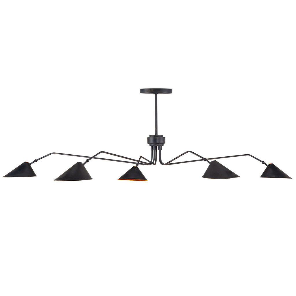 The Currey & Co Serpa Black Chandelier has a lightly weathered feel thanks to the rubbed French black finish on the slender arms and shades. Made of wrought iron, the spidery fixture has a vintage feel with mid-century modern lines. The shades have gold leaf interiors, which warms the illumination coming from this black chandelier with an industrial feel.