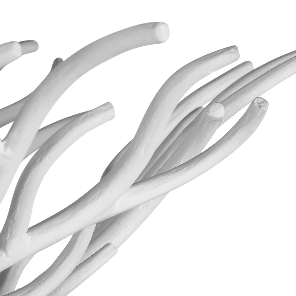 The Currey & Co Snowfall Semi-Flush Mount is made of wrought iron in a gesso white finish. Given it is made from resolute metal, it is a remarkably graceful design. Ian Thornton envisioned the white semi-flush to mimic the way snow sticks to branches after a winter storm. "The branches taper as they would in nature," he says. "I feel this fixture has a nice sense of movement."