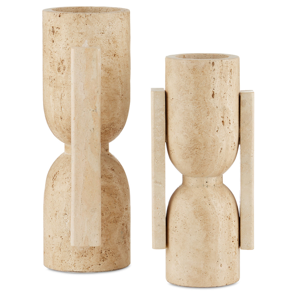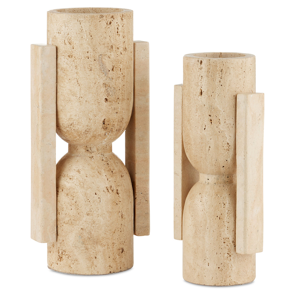 The Currey & Co Stone Vase, Face to Face Set includes two modern iterations of brutalist sculptures made of hand-carved travertine. The geometric vessels are solid on the bottom and hollowed out on top to create a vase-like opening. They are not meant for floral arrangements, as they are not water-tight. Note that the surfaces will vary from piece to piece.