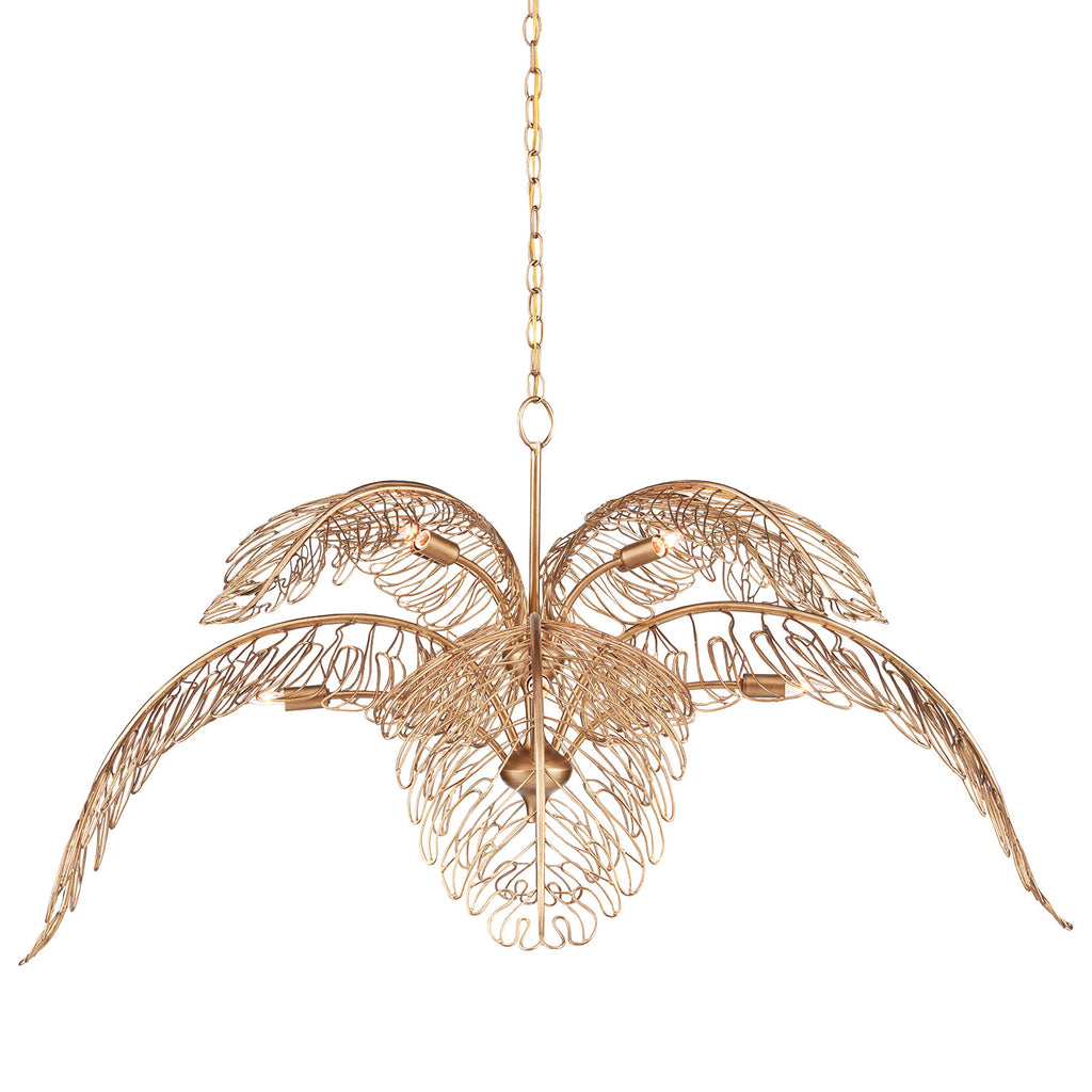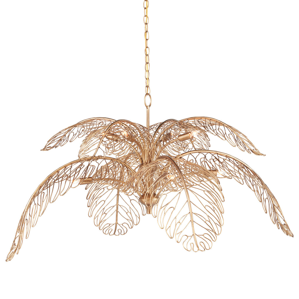 With its Italianate influences, the Currey & Co Taormina Chandelier is a handmade wonder. The metal wire from which it is made is hand-formed. Creating delicate leaf shapes from wire made of wrought iron is no small feat. The new brass finish on the gold chandelier brings it a warmth though the composition remains light and airy.