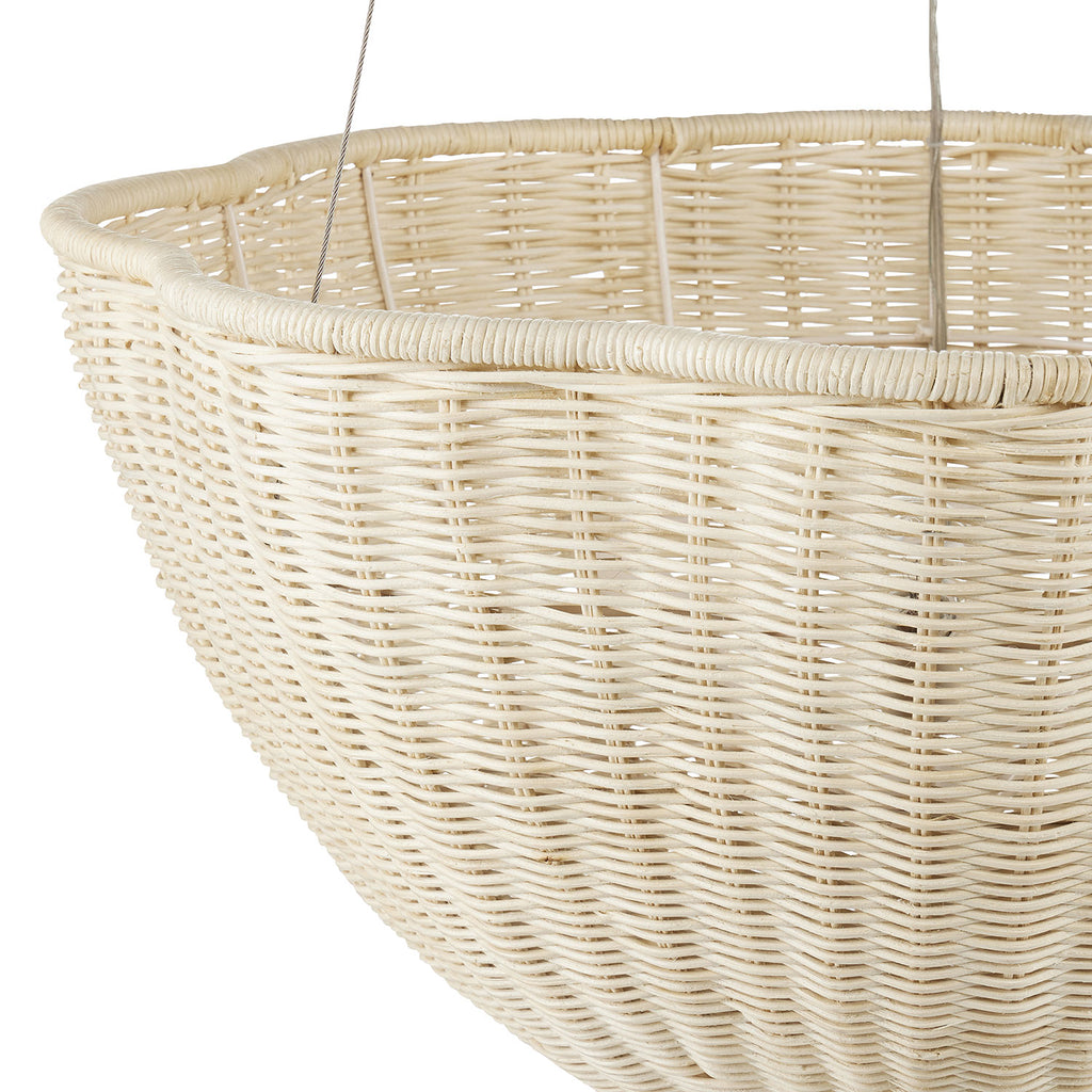 The Currey & Co Telos Pendant is made of wicker that has been bleached for a lighter feel. The beige pendant is perfect for spaces where an abundance of uplight is needed. The wicker pendant with its bowl-shaped profile is scalloped, though this is not obvious when viewed from the side. Given the nature of the woven natural material, pinpoints of light will waft through in spots.