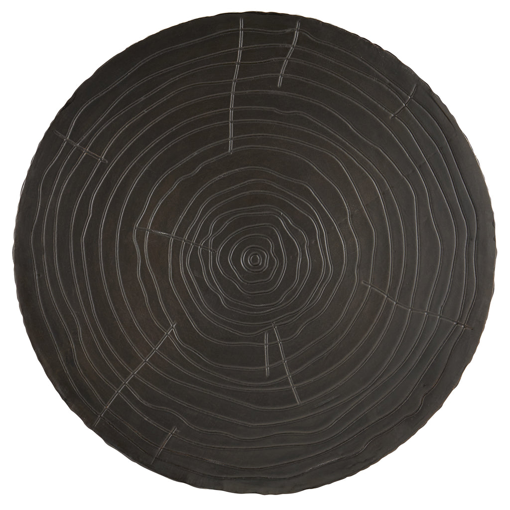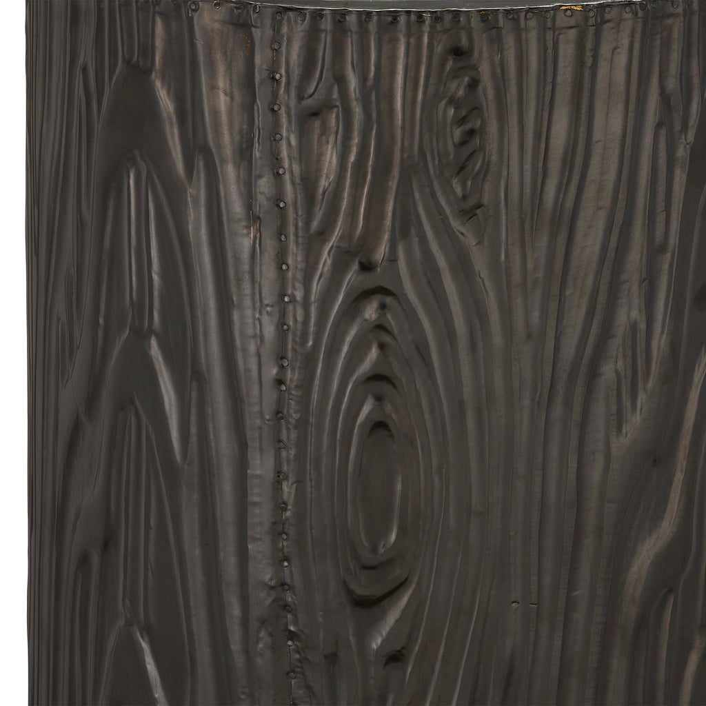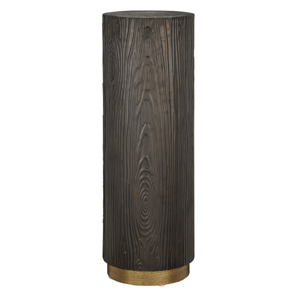 The Terra Pedestal convinces the eye that it is made entirely from natural wood, but in fact its surface is metal that has been wrapped over a hand-carved wood substrate and pushed into place to amplify a natural grain pattern. Once the dynamic ornamentation has been fully achieved, the top columnar portion is bronzed while the inset base is made of brass that has been lightly texturized. This is a truly artisanal piece.