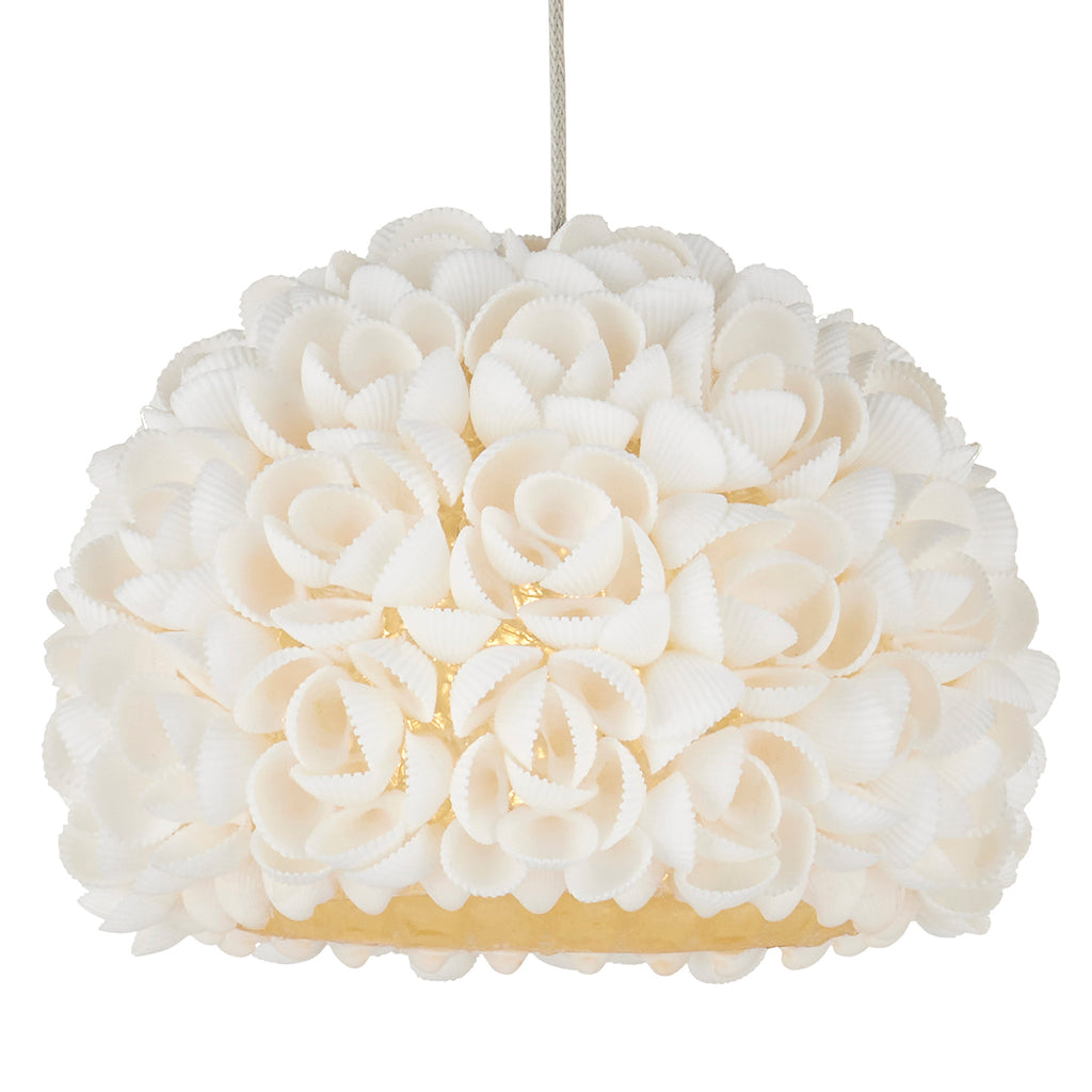 The Currey & Co Virtu 3-Light Round Multi-Drop Pendant has beautifully composed shades around which clamrose shells are fashioned to look like rosebuds; each petal hand-placed to make this an artisanal offering. The way the illumination wafts through the shade and surrounds the shells is a design detail of note with this lovely nature-inspired luminary.