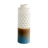 The aesthetic of the hand-crafted Cyan Design Paralos vase collection alludes to an ancient Greek vessel floating in the Mediterranean Sea. Tall, smooth cylindrical shapes of pierced earthenware are skillfully forged by hand. At the base, an aquatic-like ombre of rich blue and brown hues gives way to a crisp white center and rim with masterfully placed perforations that resemble limber holes on the side of a ship. Make a statement by placing the Paralos vessels together or individually in any covered patio, living room or entryway. Available in two sizes.
