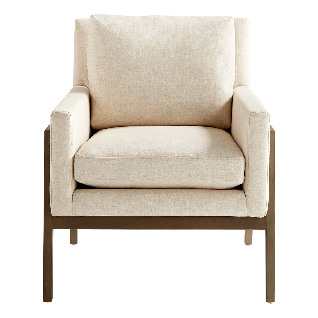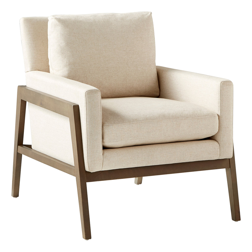 Complete the look of your living room or den whilst adding a new level of comfort, with the Cyan Design Presidio accent chair. Perfectly at home in contemporary or transitional aesthetics, the frame of this piece is crafted from solid wood in a natural mocha finish, and upholstered in a solid Cream hue that is filled with foam. It features a cushioned back and flared arms. To care for this piece, we recommend only spot cleaning as needed.
