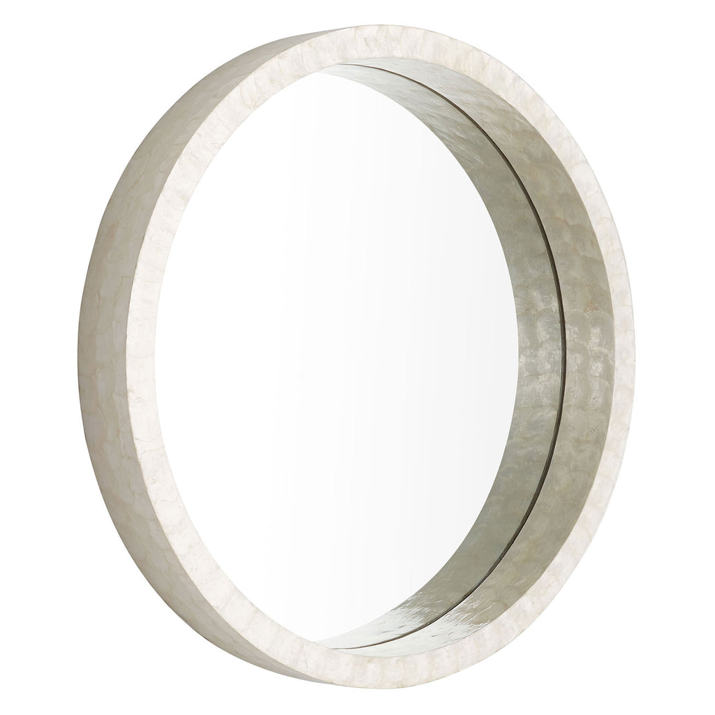 The Cyan Design Triton collection features the centuries old, enduring beauty of the capiz shell. Harvested from sea mollusks native to Southeast Asia, the capiz shells are delicately laminated before they are fixed to engineered hardwood frames that surround crisp mirrored glass. Natural tones of pearl white and taupe in the capiz shell add a subtle iridescence. The Triton mirrors are available in two shapes of two sizes and colorways. Hang over a bathroom countertop, bedroom or living room to add warmth and depth.