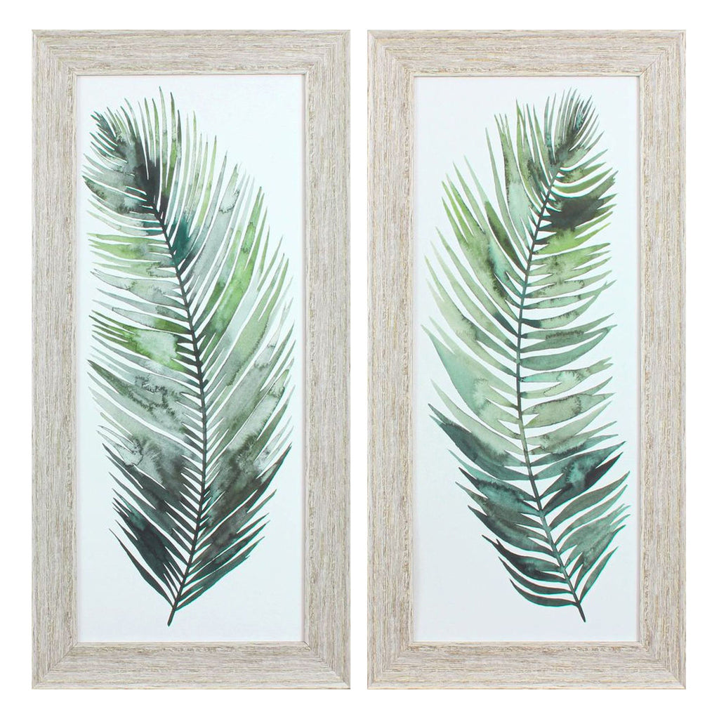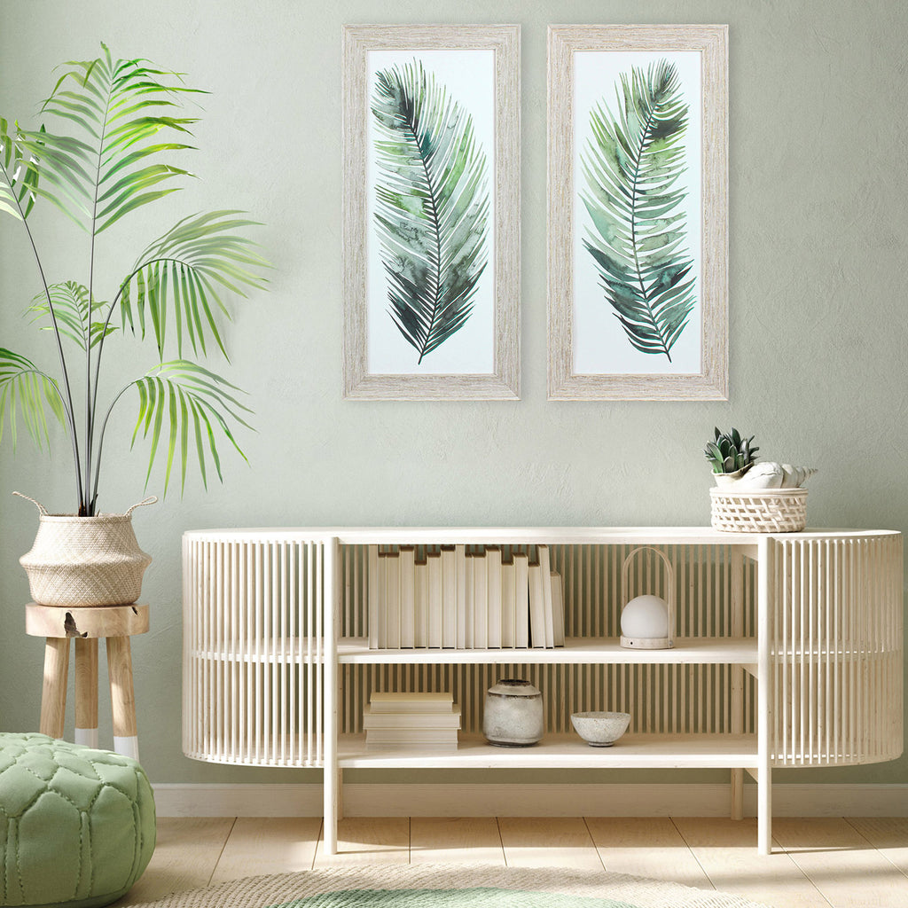 A set of two watercolor palm panel prints that are framed to size. It is then finished under glass with a complimenting white wash frame.