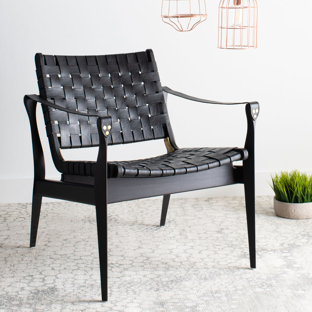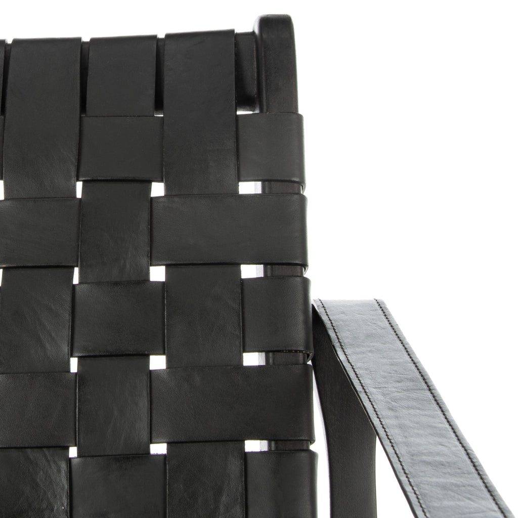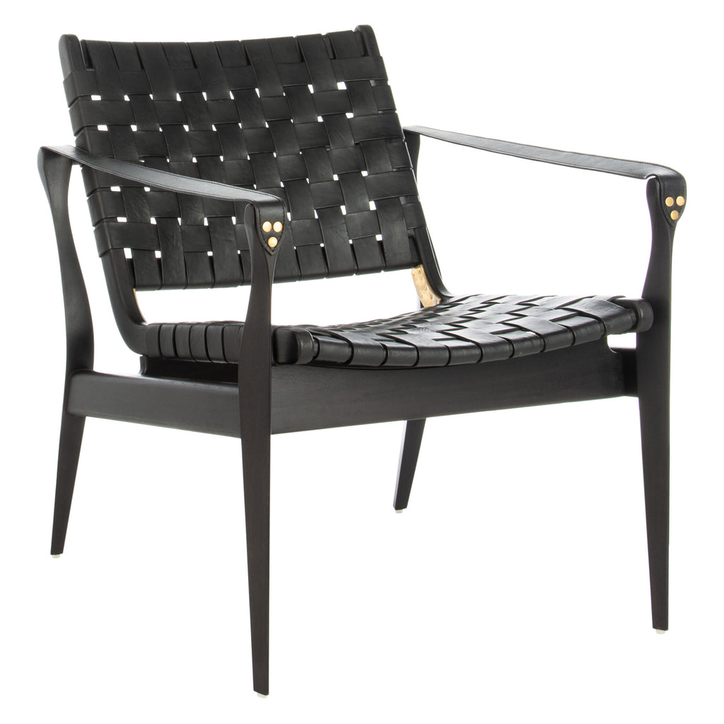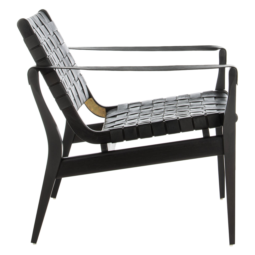 A familiar classic refreshed for the modern aesthetic, the Deluca Arm Chair combines black mahogany with upholstery of woven leather straps on its back, seat and arms. Beautifully turned legs and curved seat base recall Mid-century Danish modern style.