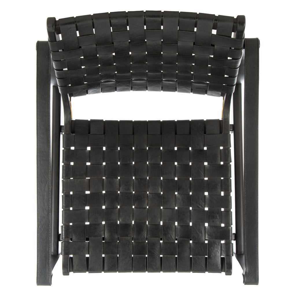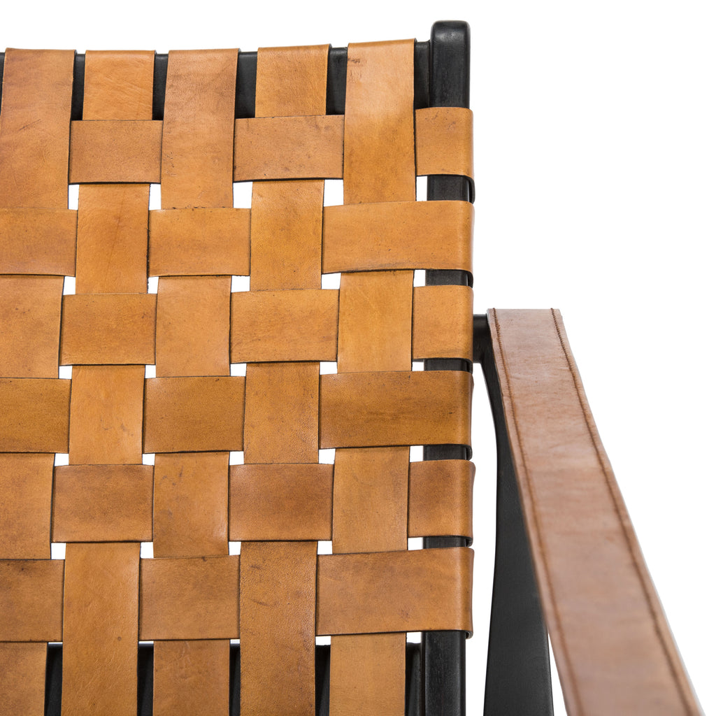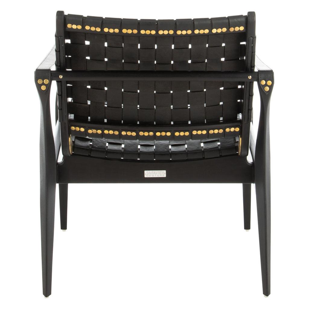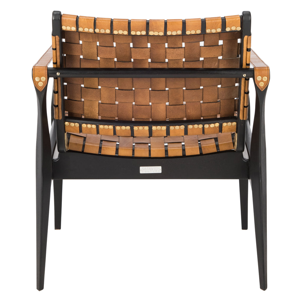 A familiar classic refreshed for the modern aesthetic, the Deluca Arm Chair combines black mahogany with upholstery of woven leather straps on its back, seat and arms. Beautifully turned legs and curved seat base recall Mid-century Danish modern style.
