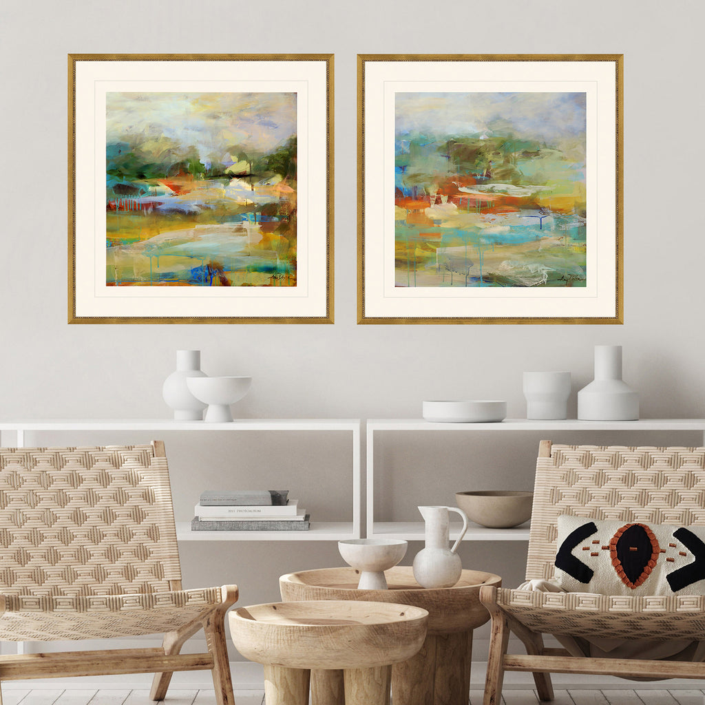 A bright abstract set is matted in white and framed in a traditional antique gold wood with beaded lip.