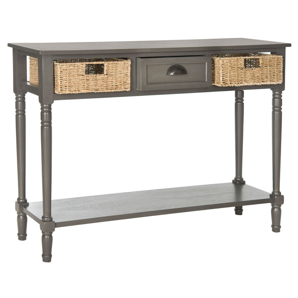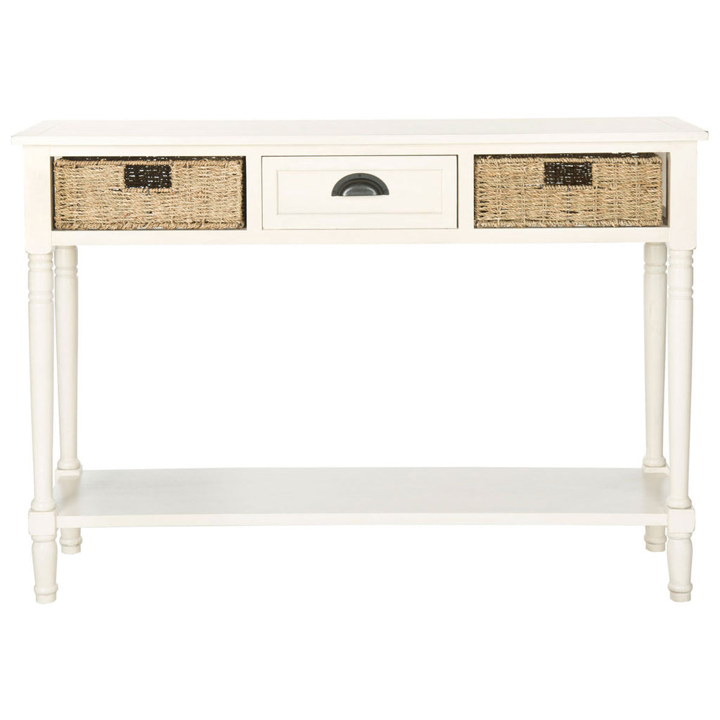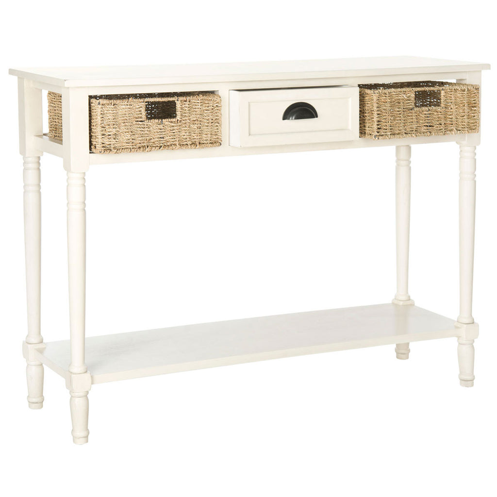 Country chic styling makes this console a welcoming statement piece for an entry hall. Crafted of pine in a grey or white painted finish, this hardworking console has a lower shelf and rattan drawers flanking a wood-faced drawer with half-moon pull.