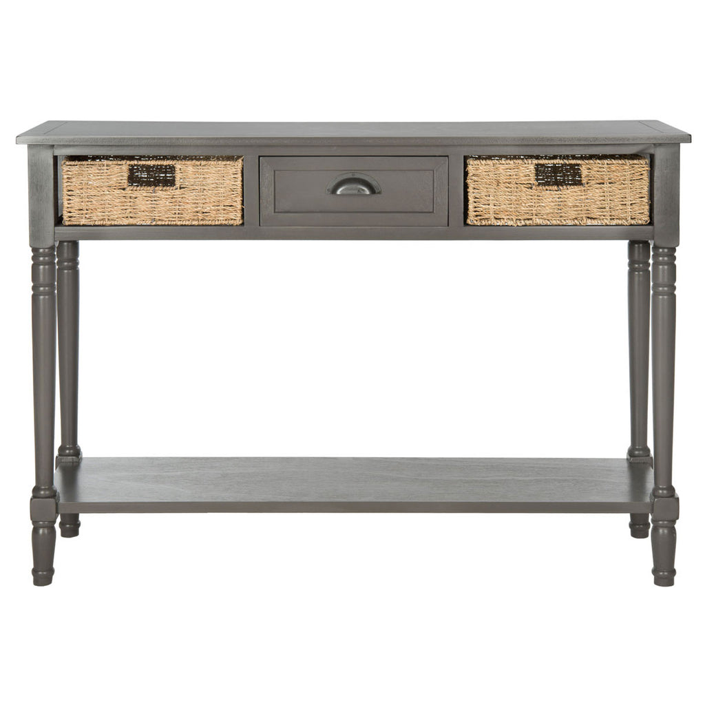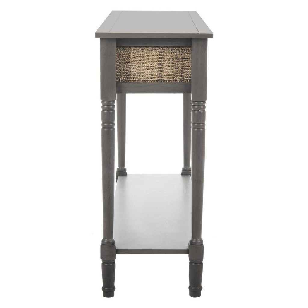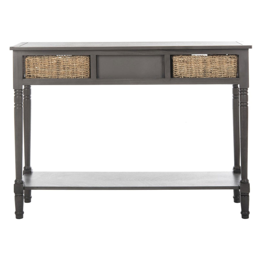 Country chic styling makes this console a welcoming statement piece for an entry hall. Crafted of pine in a grey or white painted finish, this hardworking console has a lower shelf and rattan drawers flanking a wood-faced drawer with half-moon pull.