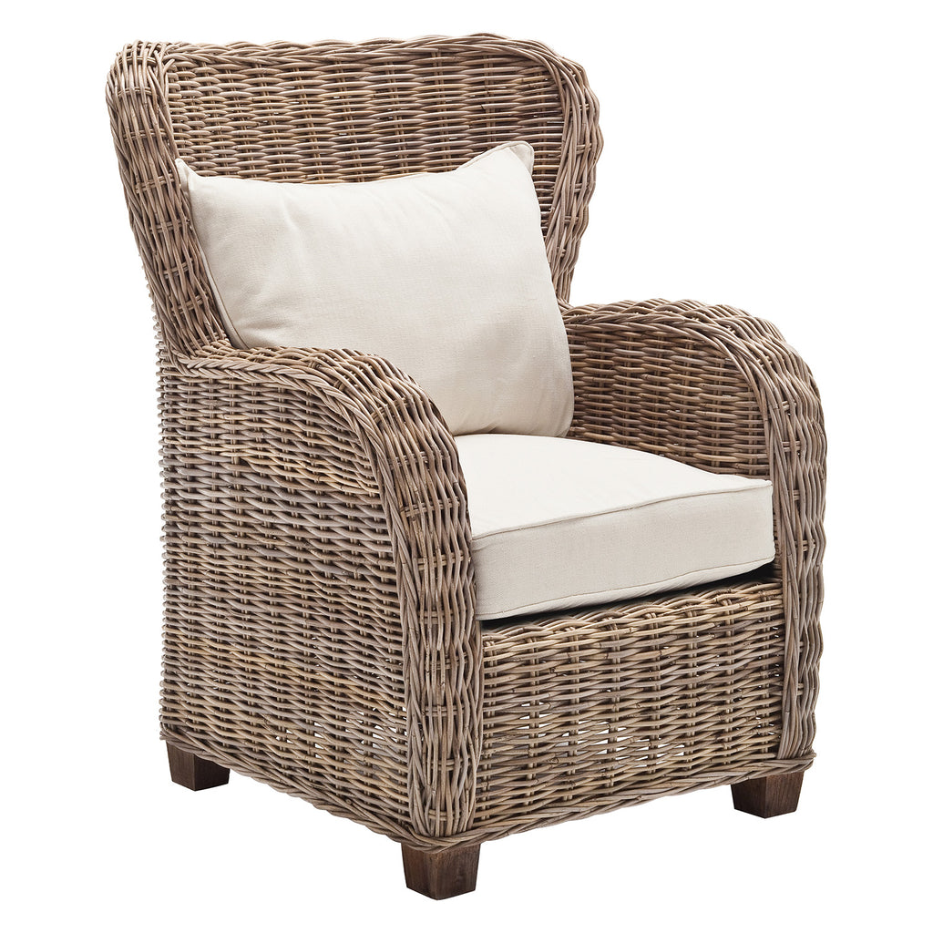 Dorchester Wicker invites nature into your home. A comforting collection of hand-woven dining & lounge chairs made with all natural kubu and split rattan in a warm ashy tone. Sink down into the deep cushions of the Queen Chair, and relax or read in style. The gently curving back and elevated arms offer extra comfort. The contrasting directional weaves of the rattan, hand woven from our naturally renewable palm, offer an interesting visual element. Sturdy wooden legs balance the look. Cushion covers, of 100% natural cotton, are removable for ease of cleaning.