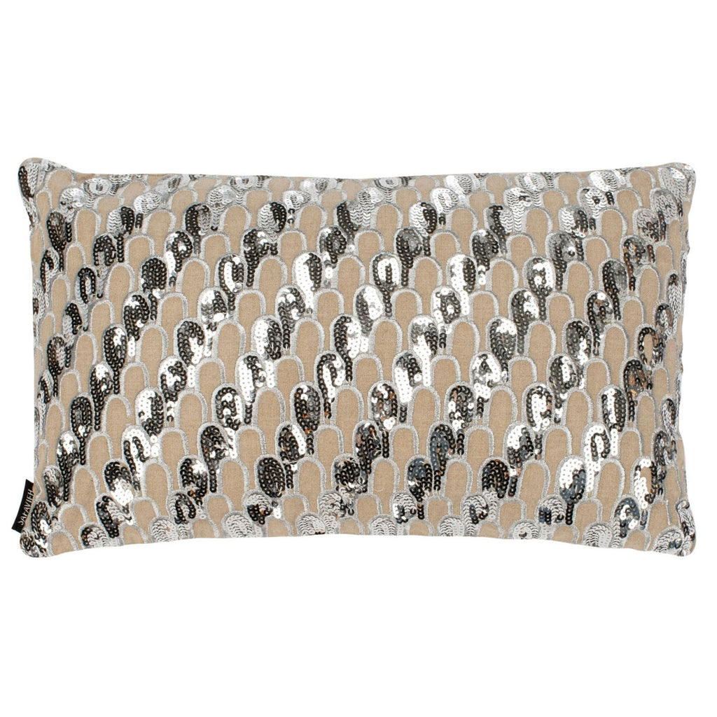 Sassy and posh, this throw pillow is a strike of style lightening, instantly updating and refreshing any sofa, chair or loveseat with its glam grandeur. Bold flashes of light beige and silver create a contemporary Deco-style pattern. Chic and dramatic, it’s the diva in any room.