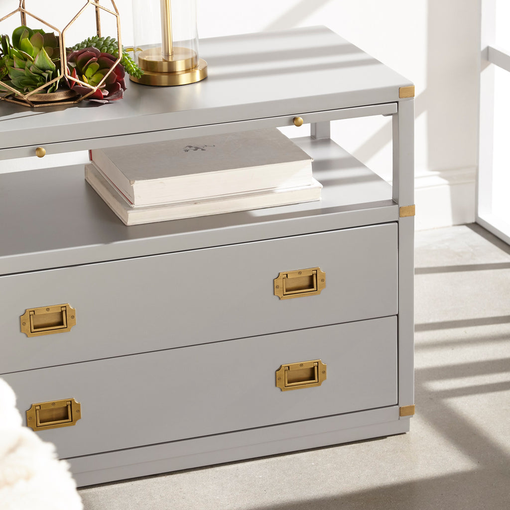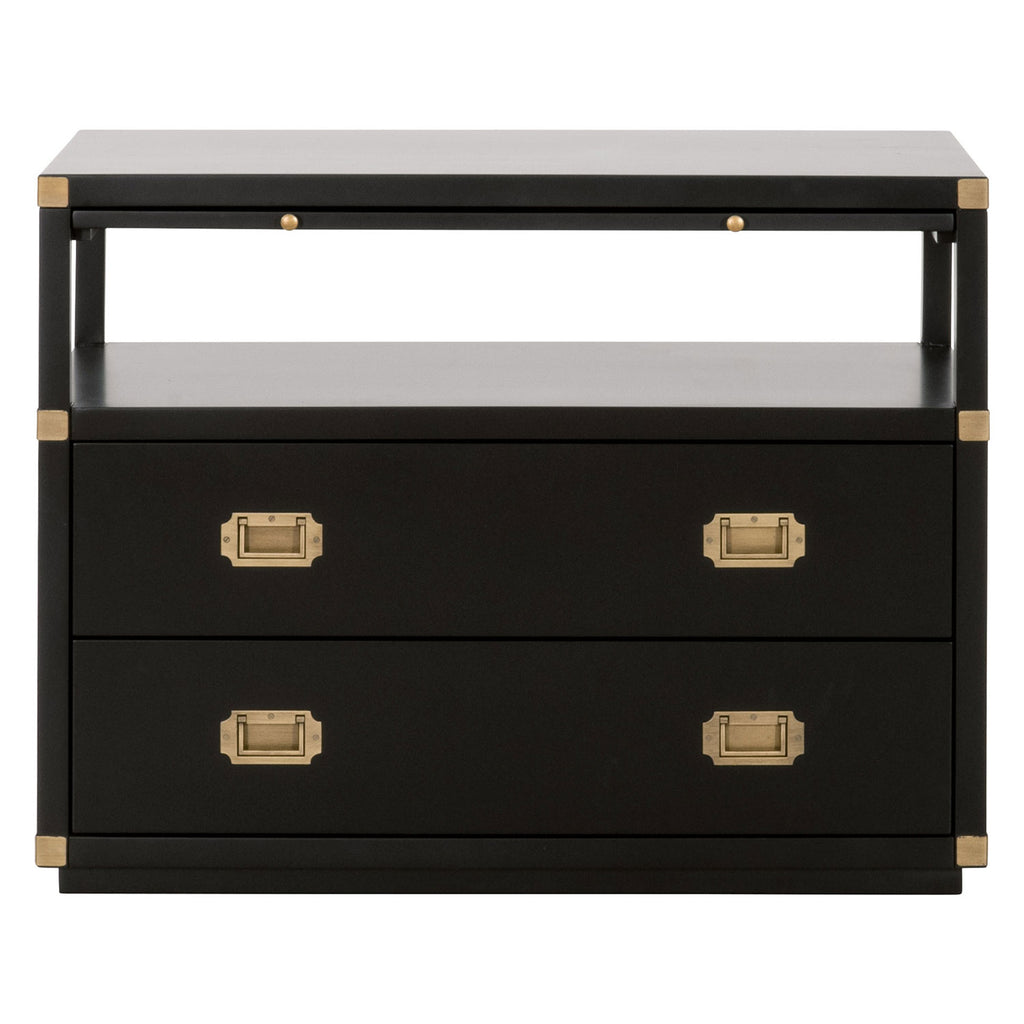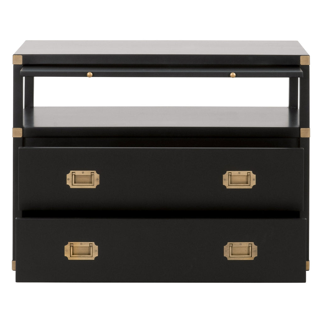 A sophisticated nightstand with a modern flare. The Bradley 2-drawer nightstand is constructed with two large storage drawers, storage shelf and pull-out tray. This bedside table has plenty of space to store all your bedtime necessities such as magazines, books, and much more. It is accented with brushed gold pull handles and hardware, giving this nightstand a transitional look that will be a great addition to your bedroom.