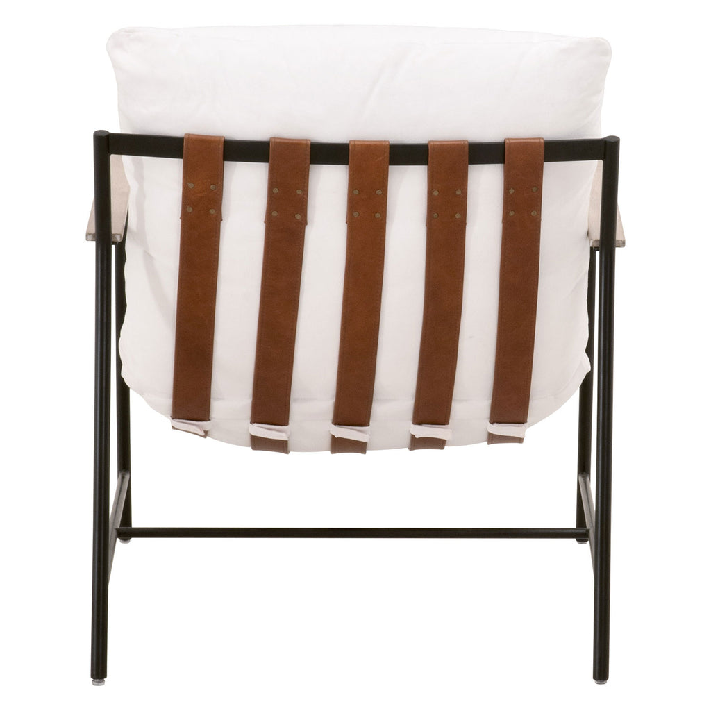 With its slimly designed base and contrasting colors, the Essentials for Living Brando  club accent chair will be a statement piece in any room. The base is constructed with black iron and solid natural gray oak on the arm rests. It has a sleek and minimalistic design featuring chestnut brown top grain leather straps to support the seat cushions. The black base beautifully contrasts the white back and seat cushions. The cushions are filled with a polyester and down blend and are removable. The fabric is also high performance, making cleaning easy. Paired with other transitional pieces, this club chair will mesh well with many interior designs and furniture styles. Stitch & Hand Collection's Top Grain Leather is made from natural cow hides. These hides may contain creases, small blemishes and unavoidable variances in color. Each piece is unique and any variation should be considered part of the beauty of this natural product.