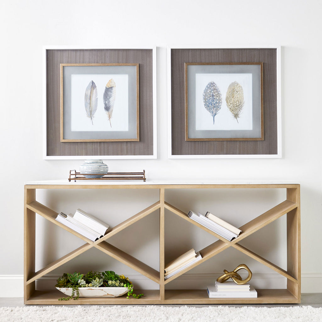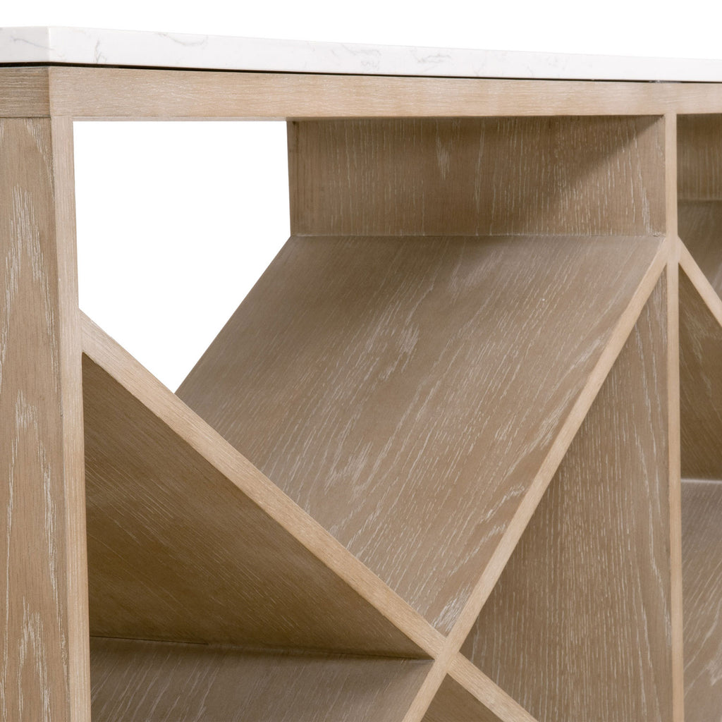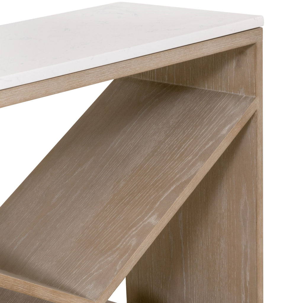 The Essentials for Living Cellar console table is sure to make a great addition to your entryway or living room. Crafted with solid smoke gray oak wood and a beautiful quartz top, this table is absolutely stunning. The elegant white quartz top is designed with gray veining, made to resemble white marble. The eye-catching table base is constructed with a unique design that can be used for storage or decorative pieces. The table would make a great sofa table, media table or entry table as well. It will fit in well in any transitional living space. Bella Antique Collection products are made with natural stone, antiqued metal, concrete, and reclaimed wood. These products include unavoidable variation in color, texture, uneven grain, blemishes, scratches, marks, and cracks. These features are not defects, but rather the material's natural characteristics.