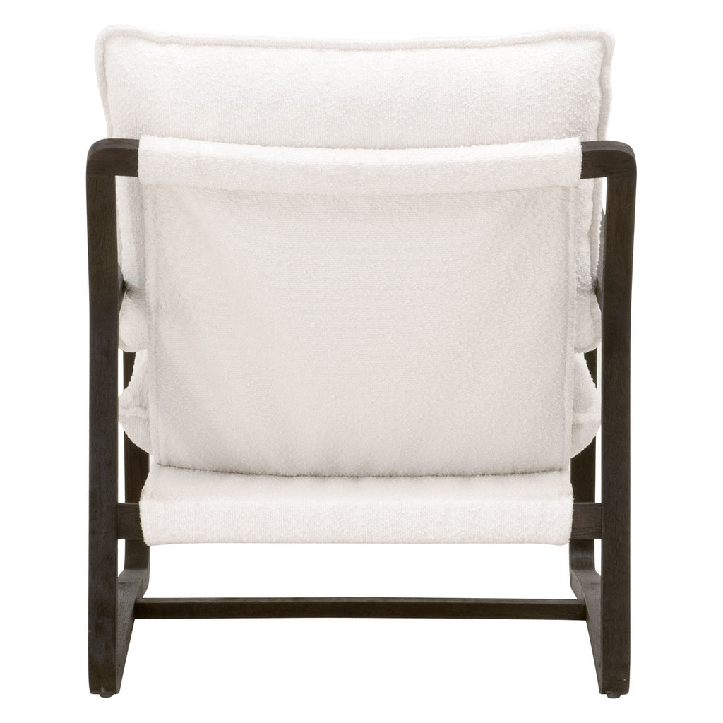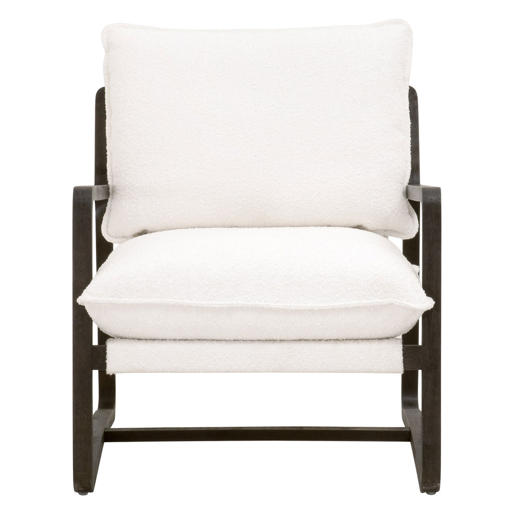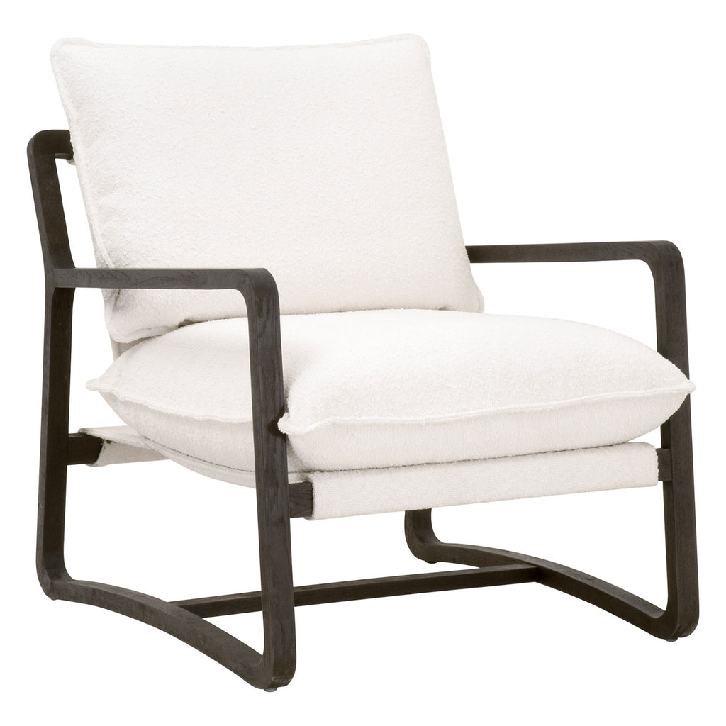 With its slimly designed base, unique fabric, and contrasting colors, the Essentials for Living Hamlin club accent chair will be a statement piece in any room. The contemporary sled design base is made of a dark brown oak with matte finish. This starkly contrasts the gorgeous white boucle fabric that makes up the sling support and back and seat cushions. The cushions are filled with a polyester and down blend and are both removable and reversible. The fabric is also stain-resistant, making cleaning easy. Paired with other transitional pieces, this club chair will mesh well with many interior designs and furniture styles.