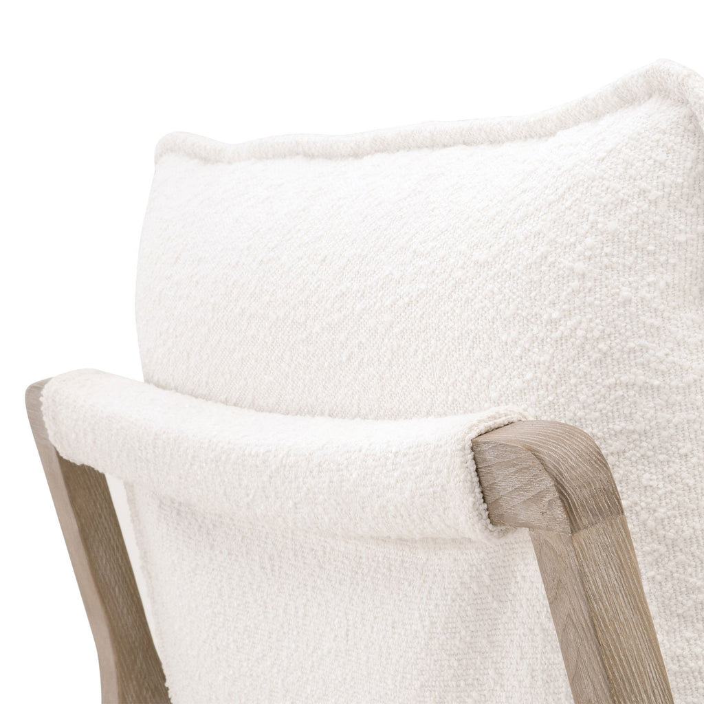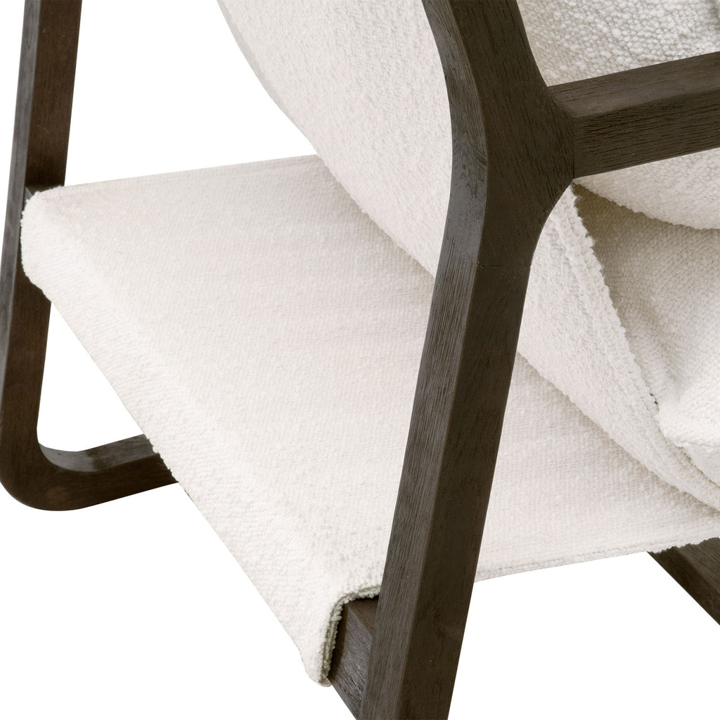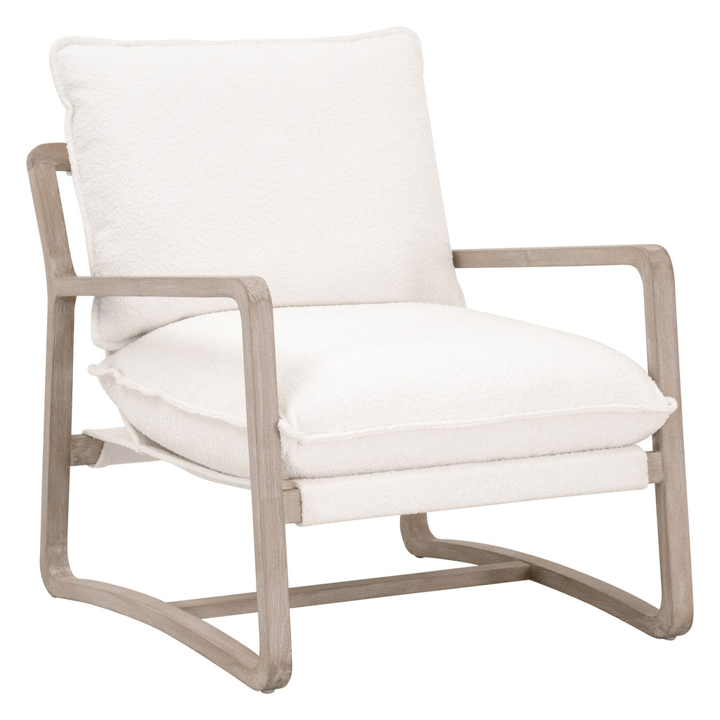 With its slimly designed base, unique fabric, and contrasting colors, the Essentials for Living Hamlin club accent chair will be a statement piece in any room. The contemporary sled design base is made of a dark brown oak with matte finish. This starkly contrasts the gorgeous white boucle fabric that makes up the sling support and back and seat cushions. The cushions are filled with a polyester and down blend and are both removable and reversible. The fabric is also stain-resistant, making cleaning easy. Paired with other transitional pieces, this club chair will mesh well with many interior designs and furniture styles.