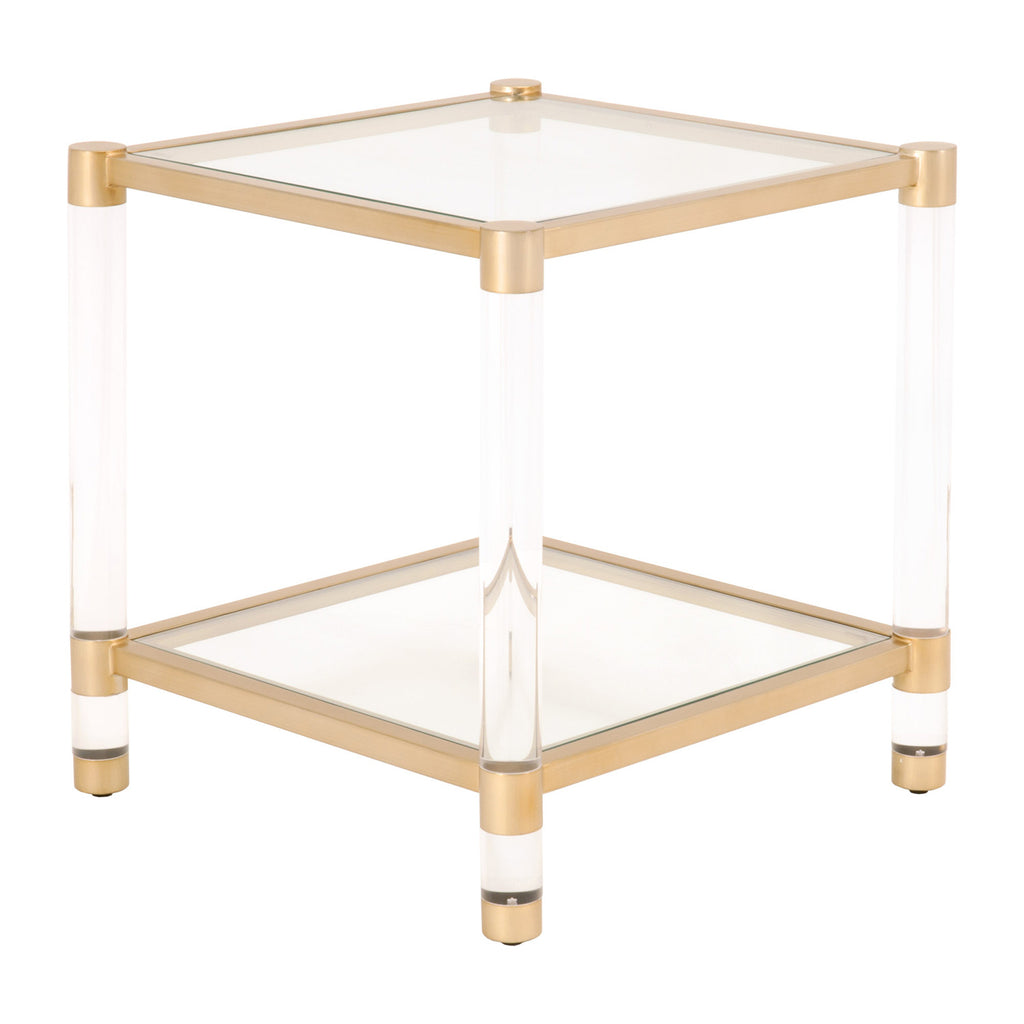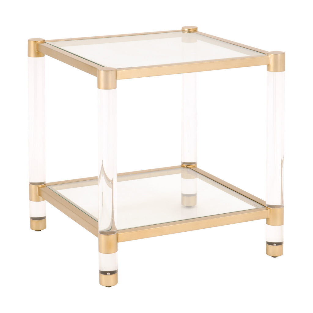 The Nouveau transitional style end table featuring a tempered glass top and shelf with a stainless steel frame and clear acrylic legs.